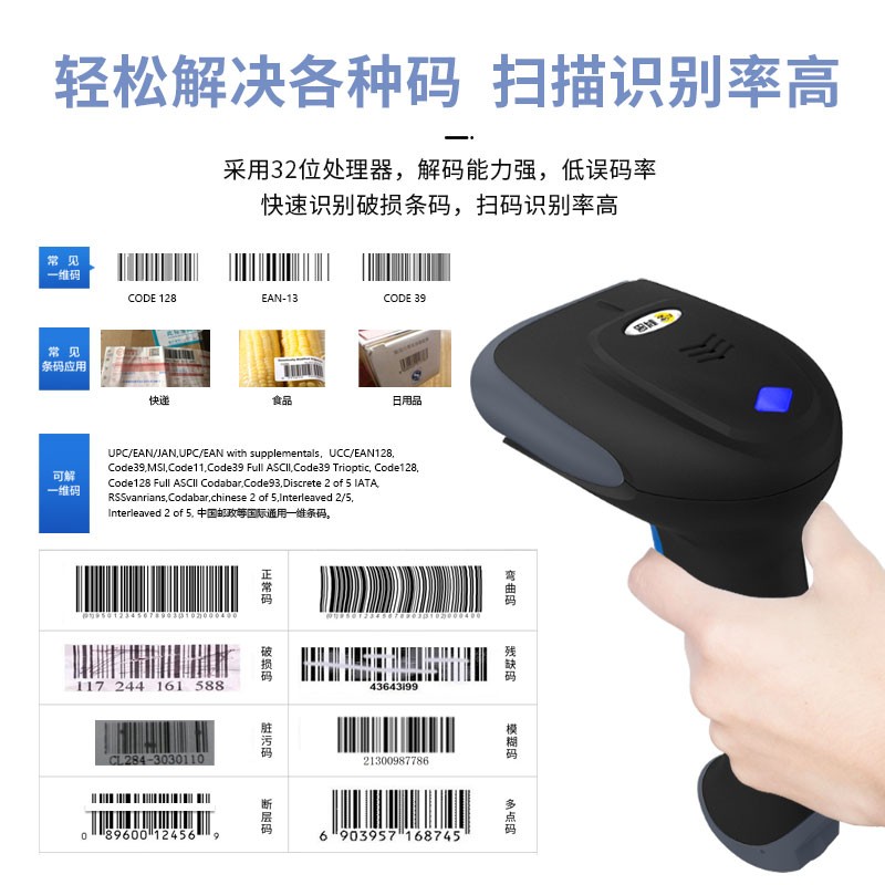 读码速度达到100次,秒扫描速度更快,识别率更高,智能无线2.4G双向传输数据传输,信号强,穿透绕射能力强,无障碍物及信号干扰情况下,传输距离约100米,32位高性能芯片,解码能力强,能识别市面上,大部分的一维维码,扫码就是快,采用优质镭射激光头,更快更灵敏,快速一维码满足市面上大部分条码扫描的使用需求。