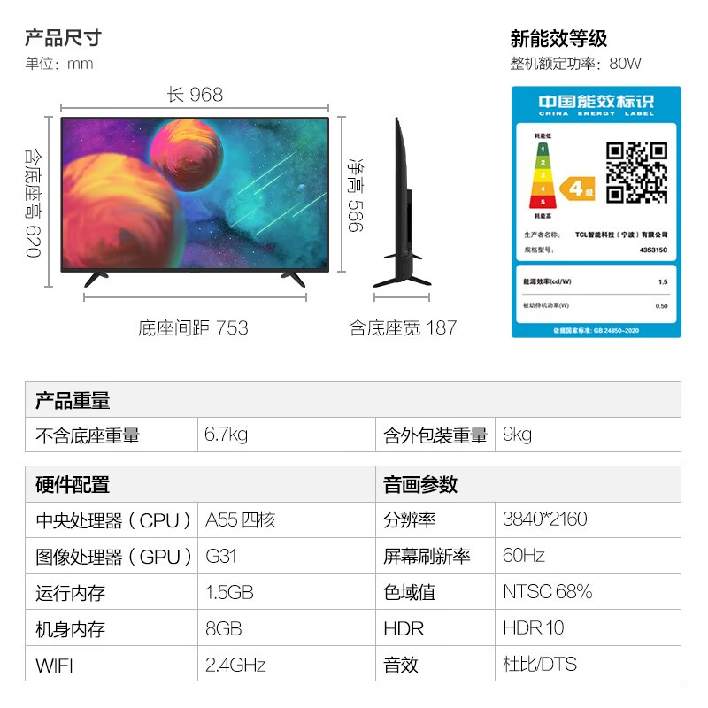 FFALCON 雷鸟 S315C系列 液晶电视,软件算法局域控光,4K+HDR增强,杜比+DTS双认证,AI智能场景引擎。支持手机语音控制,多屏互动,T972芯片,A55四核,1.5GB+8GB内存,安卓9.0系统,HDMI2.0接口*2,直下式背光,窄边框设计。