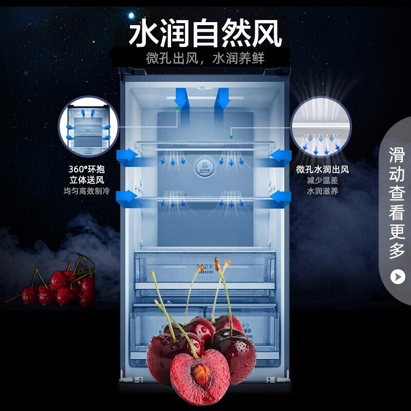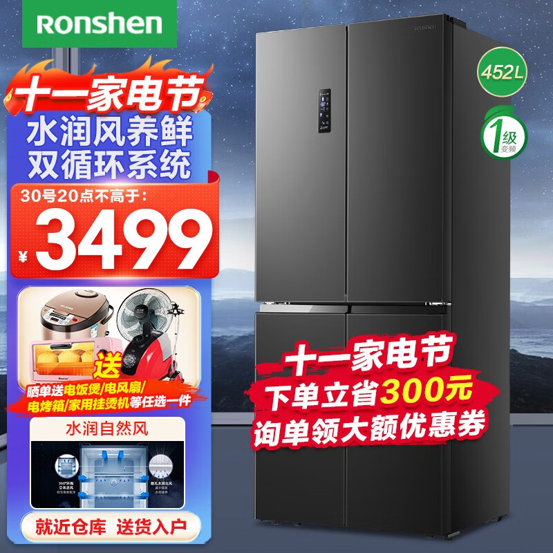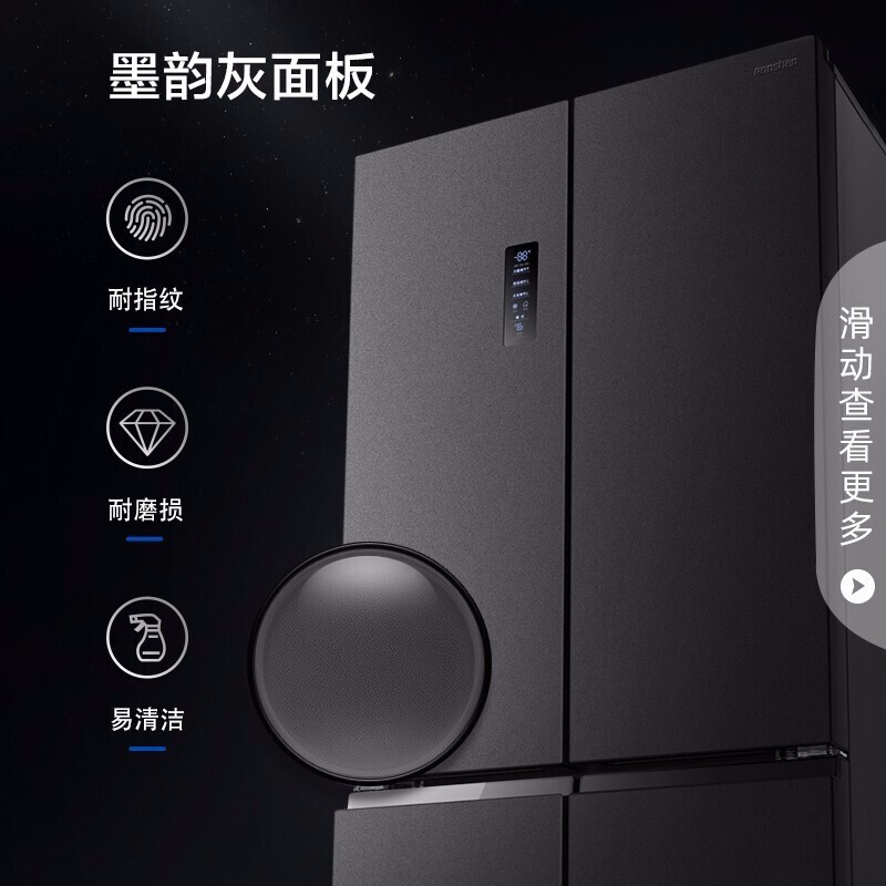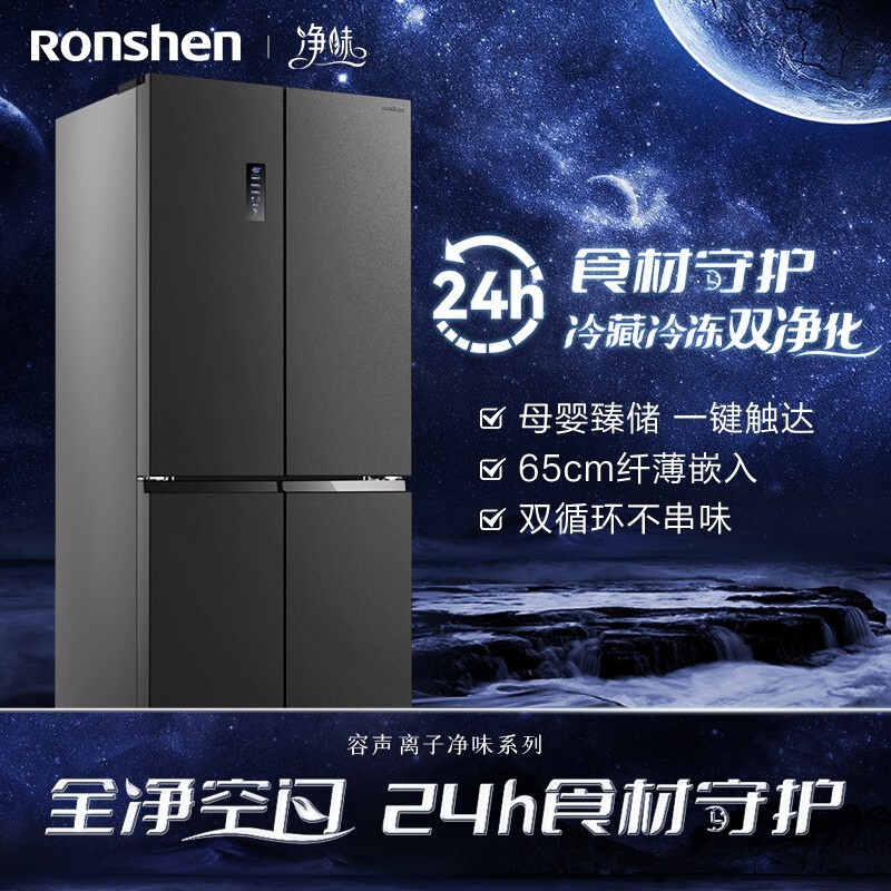 容声 离子净味系列 BCD-452WD12FP 风冷十字对开门冰箱,总容量为452L,其中冷藏室299L,冷冻室153L,含门厚度仅为650mm,轻松嵌入柜体。采用全时双驱变频,矢量双变频压缩机搭配一体式离心风机,控温更加精准,综合耗电量仅为0.78kwh,冷冻能力高达8kg/12h,实现-25℃深冷速冻。采用双循环系统,冷冻冷藏各有一套冷凝器,减少食材的串味和冷凝效应。冷冻、冷藏室均搭载抗菌除味系统,冷藏风道内置钯银离子除菌,还可以除乙烯,冷冻采用铜离子快速分解细菌,高效除味。多层微孔出风,利用化霜水汽增加冷藏室湿度,果蔬可以保持一周水润。冷藏室设置蓝光,延长果蔬光合作用,持续保持鲜活状态。