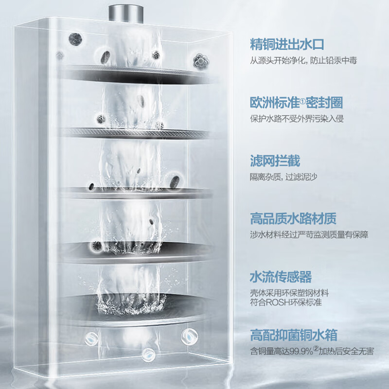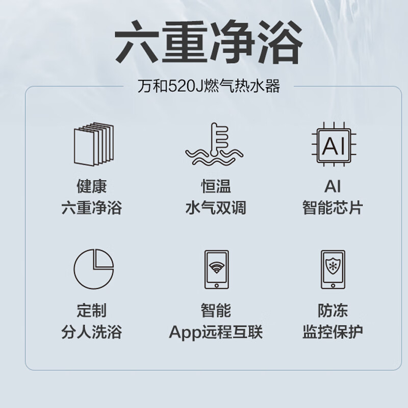 这款Vanward 万和 520J系列 燃气热水器,容量有13L、16L两个规格,采用强排式排烟方式,二级能效,适用气源为天然气,热效率大于89%;触摸按键控制方式,六大净浴系统,水气双调科技,水温可定制;拥有智能氧护功能防CO中毒、40分钟定时停机,48℃安全锁防止儿童烫伤功能,以及防雷击技术,使用安全可靠;还有一键节能模式,节能省钱;0.02MPA低压启动技术,无惧使用环境,老旧小区、高楼层、用水高峰时段都可以放心使用。