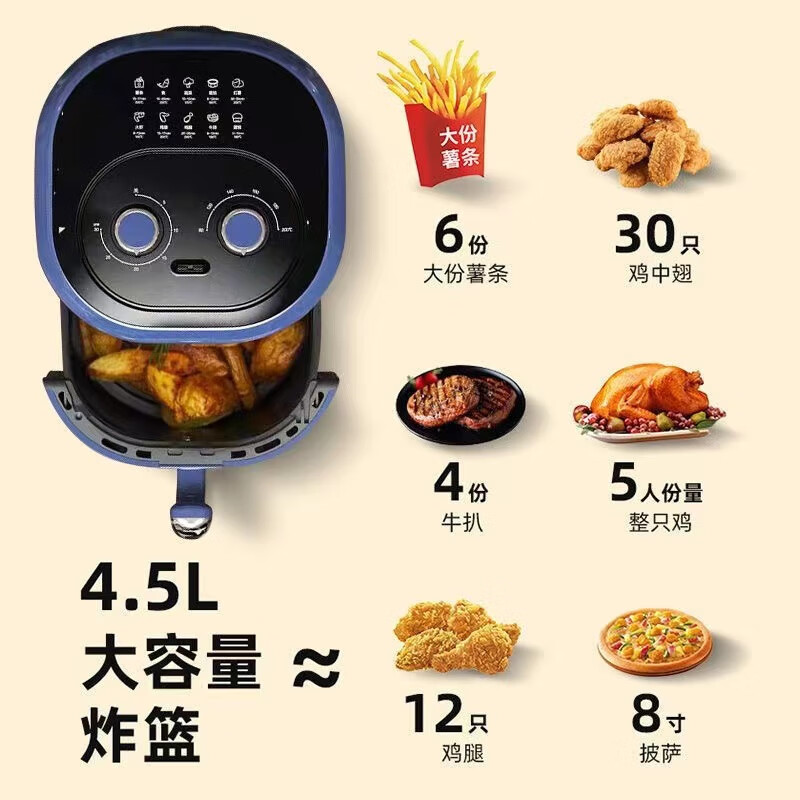 Midea 美的 GB-AF5C1 空气炸锅 4.5L 高温热风烘出食材的油脂用作烤,减少食物中的油脂含量,无需放油,吃的更健康。360度高温热风循环,机械式旋钮操作,火候随心控,准确到1度的控温。4.5L黄金大容量,1350W强劲热风。Midea 美的 BG-AF5b 空气炸锅 4.5L 高温热风烘出食材的油脂用作烤,减少食物中的油脂含量,无需放油,吃的更健康。食用级不沾涂层,耐磨易清洗,油脂残渣一冲即净。