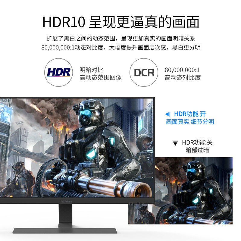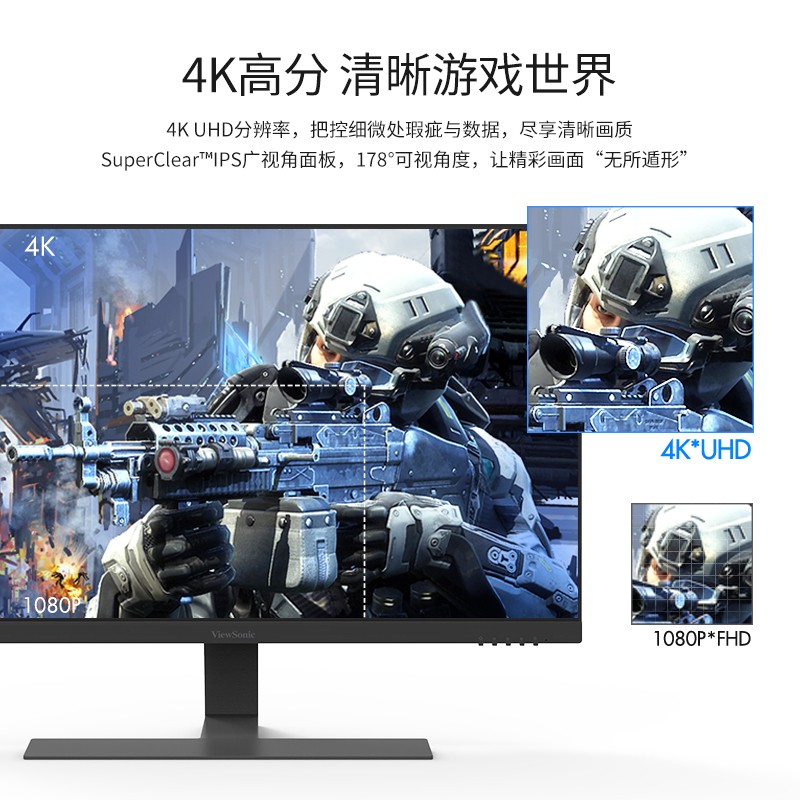 这款显示器采用 8bit抖动10bit 的Super Clear™IPS广视角面板,分辨率为3840×2160,支持HDR10,拥有10.7亿色数,99sRGB色彩范围,出厂前经过色彩校正,满足专业图像领域对精准颜色的需求。支持HDCP 2.2技术,三边窄边框设计,多显示器拼接,视觉效果更舒适宽广。接口丰富,显示器配备了 HDMI*2+DP 接口,可以轻松连接多种办公和娱乐设备,兼容性更高。入门级价位的4K显示器,性价比不错,虽然对 HDR10 的支持并没有多少观感的提升,但聊胜于无。尤其对 PS4、PS5 玩家来说,用这款显示器打游戏反而物美价廉。