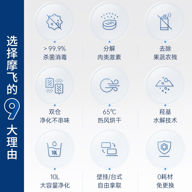 Morphy Richards 摩飞 MR2061 食材净化器,摩飞电器MR2061,操控方式:电子式,特色功能:果蔬清洗,双仓净化,肉类清洗,自动排水,涡流洗涤,清洗容量:8L以上,消毒方式:羟基水离子,放置方式:台式壁挂两用,适用场景:家用。