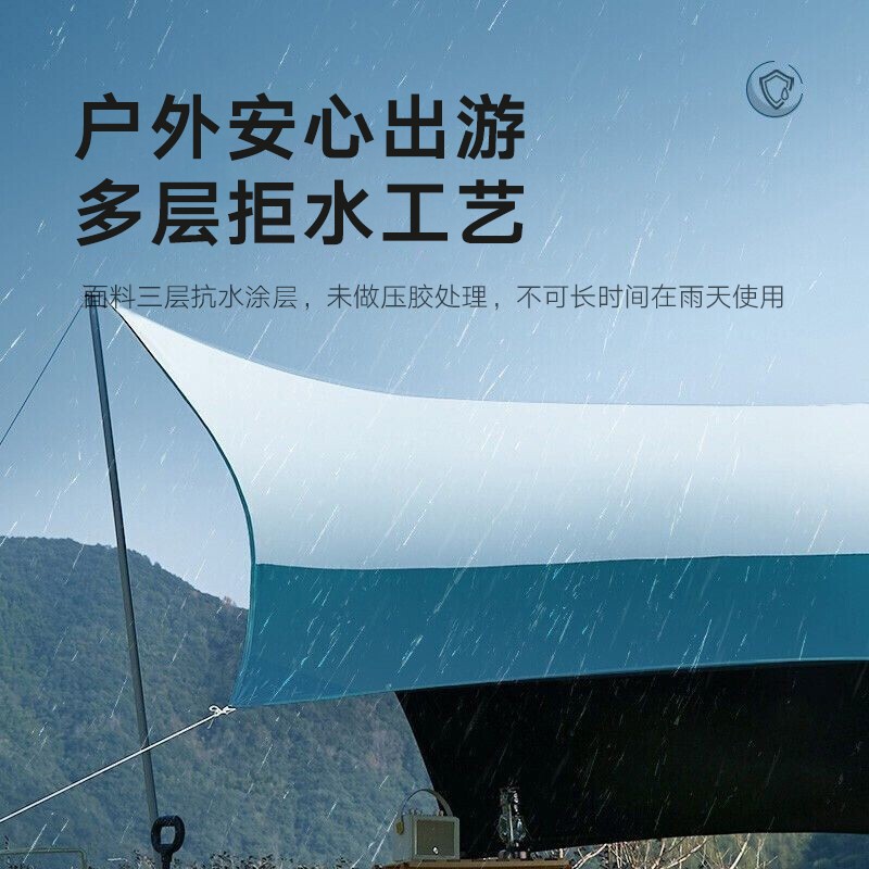 蝶形造型,搭建起来时尚美观,可单独搭建,也可与帐篷连接搭建。黑胶天幕,更低的透光性,有效遮挡阳光,即使在烈日下,也能形成树荫般的遮阳区域。多层涂抹工艺,有效遮阳,阻挡紫外线,无惧晒黑晒伤。