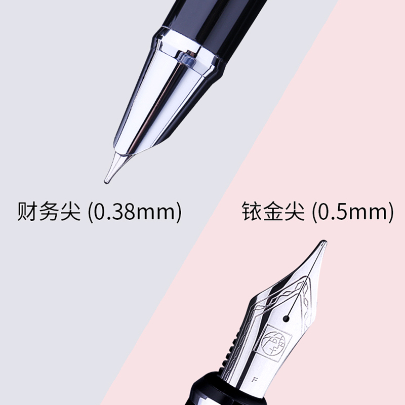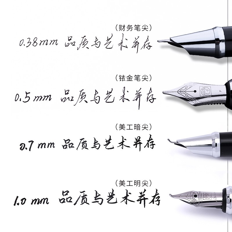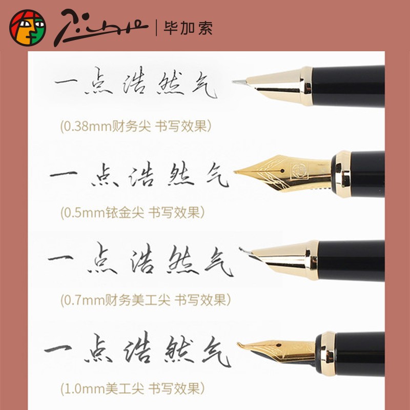 毕加索(Pimio)这款717钢笔,笔尖采用铱金制造,选用明尖嵌入方式,弹性好,书写顺滑流畅,不易刮纸,经久耐用。笔杆运用金属材质制成,握感舒适。使用旋转吸墨器吸墨,旋转旋钮直到活塞头完全下放到底,再反方向旋转旋钮,收回活塞吸入墨水。在笔杆颜色方面,拥有银灰色、瓷白色、亮黑金夹、玫瑰金、亮黑银夹、雾霾蓝金夹、玫瑰金金夹和银灰金夹八种颜色可以选择;在书写粗细方面,拥有0.38mm、0.5mm、0.7mm和1.0mm四种可以选择。