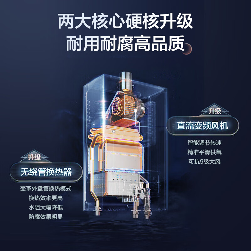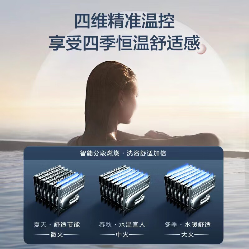 本机语音智能,双增压零冷水,磁净抑垢洗,玻璃全面屏,小巧节能省气,双增压水量可增至150%,循环增压泵动力强劲,大水量酣畅沐浴,循环速度提升38%,循环省时38%,耗气量少,节能省气节能可视化,耗气比心中有数,拒绝浪费。