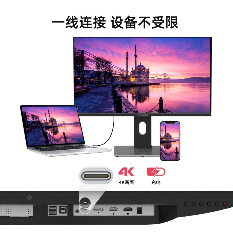 VX2880-4K-HDU 配备28英寸IPS显示器,采用的是微边框全面屏,黑边仅有6mm。拥有4KUHD高清分辨率,127%sRGB色域容积,100%sRGB色域覆盖率,支持 Typec接口主流手机、笔记本、平板电脑一线连接投屏,配备HDR1O高动态范围图像技术,拥有300cd/m2高亮度,所呈现画质亮度动态范围更高、色域更宽、优化隐藏在黑影和过曝光的细节。拥有2个HDMI、1个DP以及 Typec接口。可同时连接多个设备,搭配可调节支架。