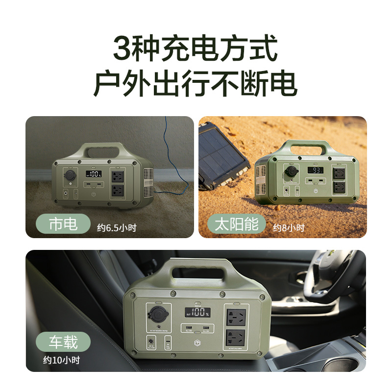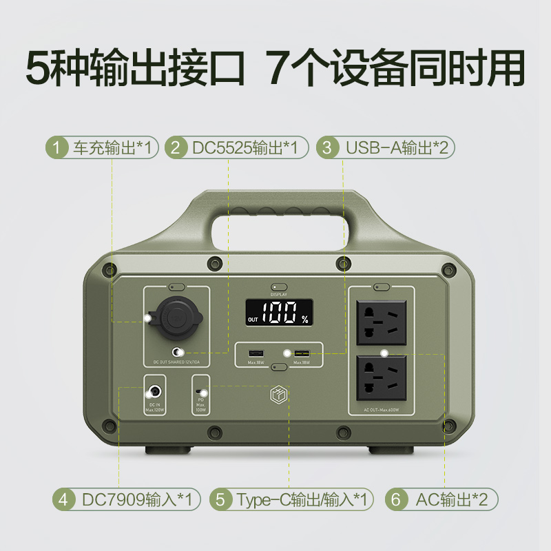 这款户外电源,拥有600W大功率,680.8Wh大容量,拥有车充输出*1、DC5525输出*1、USB-A输出*2、DC输出*1、Type输入输出*1、AC输出*2。 AC口采用纯正弦波输出,稳定可靠。LED智能显示,CQC认证,汽车级动力三元锂电信,可达1000次循环寿命。BMS电池管理系统,八重安全防护。外观采用双面散热孔设计,V-0级防火阻燃外壳,防尘橡胶塞,防滑脚垫。120W大功率太阳能电池版,可折叠便携,MPPT跟踪技术,IP67防尘防水。
