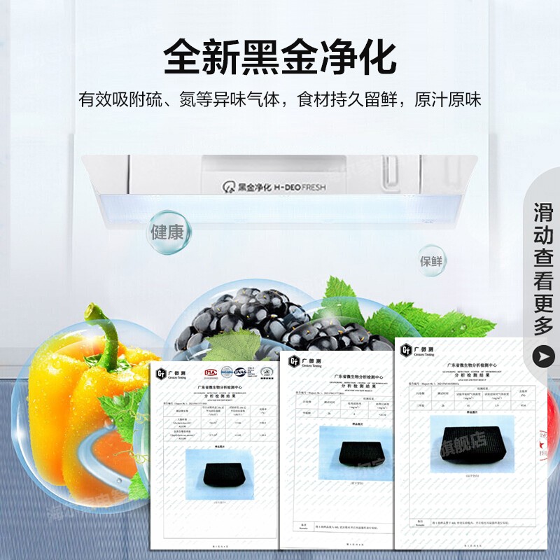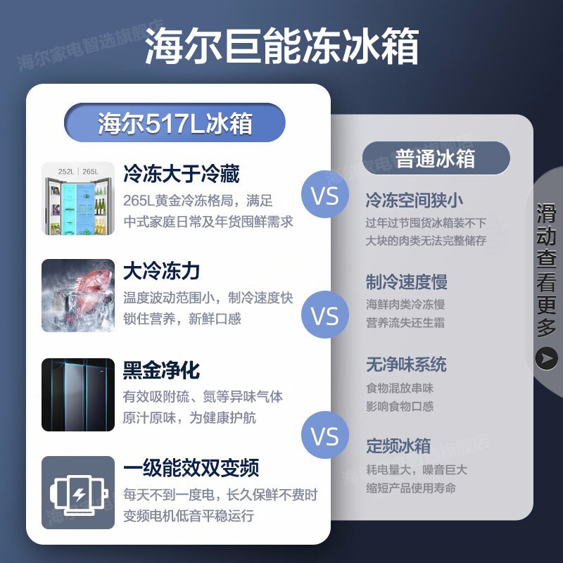 Haier海尔BCD-517WLHSSEDB9双变频冰箱是22年最新上市的一级双变频大容积冰箱,一级双变频:变频压缩机+变频风机,一天不到一度电,制冷更快、节能静音; 分层多路送风:采用精控传感器,配合冷藏、冷冻多出风口,温度均匀,波动性小;黑金净化:有效吸附清洁冰箱内的气味,全面呵护食材健康、守护食材原鲜口感; 风冷无霜:采用风冷控制系统,免除除霜烦恼; 90°开门悬停:门体打开至90°,抽屉可无障碍抽取,门体可自动悬停,释放双手; 265L大冷冻:打破常规储鲜,远超常规冷柜,相当于为家再添一个小冷柜; 舒心品质:柔和光线不刺眼,人体工学把手更开合省力等等小细节。