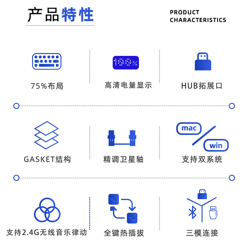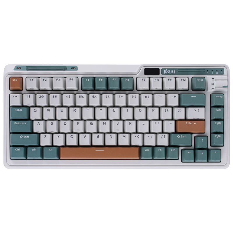 珂芝 K75采用紧凑型布局设计,K75节省了桌面30%的空间,新增HUB接口,HUB需要在有线模式使用,最左侧C口为键盘连接。内置4层消音棉,轴下垫+夹心垫+双重底棉,有效填充键盘内部空隙,消除大部分空腔音,让按键声音更加纯粹动听。键盘采用PC定位板,GASKET软连接结构,在键盘底部添加硅胶软垫,手感和键音更好。出厂自带润滑,细心调校卫星轴与平衡杆,让大键位手感更加平衡,减低大键杂音。全键可随心更换轴体,支持三脚轴,五脚轴等,选择心仪的轴体,DY属于自己的键盘。三模连接,支持有线、2.4G、蓝牙三种连接方式,可在多个设备中自由切换,通过旋钮调节。全键无冲。3750mAh大容量电池,机身内置锂电池,可反复充电,有线连接时兼顾充电。续航有道,长久耐用。酷炫背光,多种动态灯效切换,高含量PBT拼色键帽搭配酷炫背光,支持五档亮度与速度调节动态背光营造酷炫游戏氛围。有线,2.4G连接驱动都可以识别,可实现自定义键区,1600万RGB光效自由设置、编程、游戏快捷键轻松自定义。轴体型号:TTC金粉V2、TTC快银V2、TTC静音红V3、凯华BOX红V2。