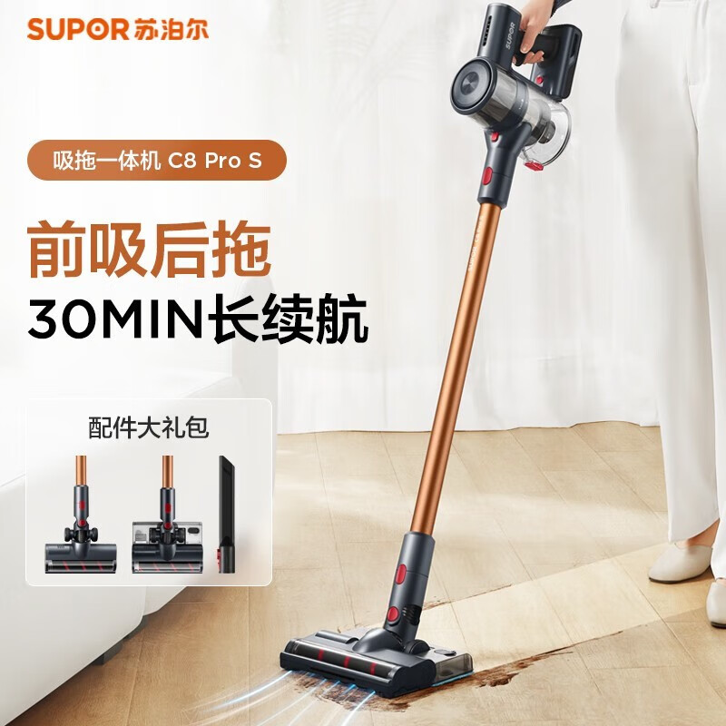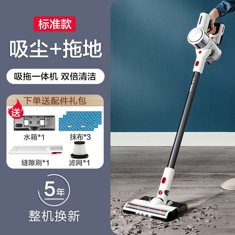 前吸后拖,除尘拖地一机搞定,15000Pa强劲吸力,深度清洁更省力,大容量磁吸式水箱,吸拖一次省心搞定,1.22Kg轻量主机,方便清理窗帘等高处,30分钟持久续航,满电可清洁108平方米面积,两档可调随心吸,一键切换应对不同脏污场景,4重过滤系统,拒绝空气二次污染,壁挂+缝隙刷组件,缝隙好清洁,壁挂好收纳,前置LED照明灯,暗处灰尘也不放过。
