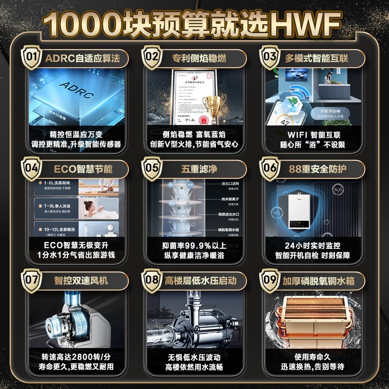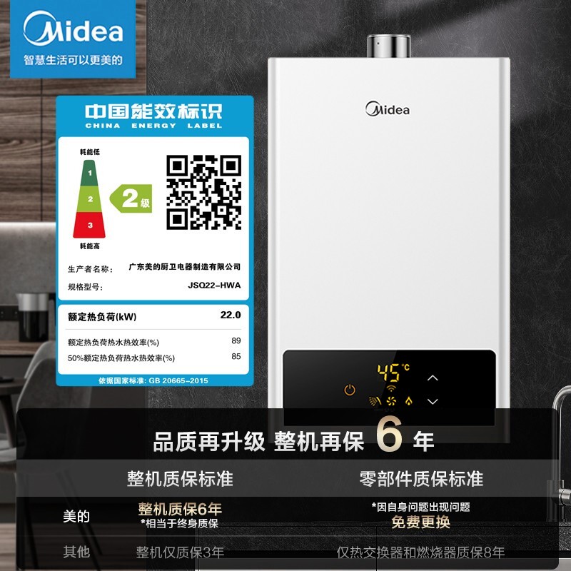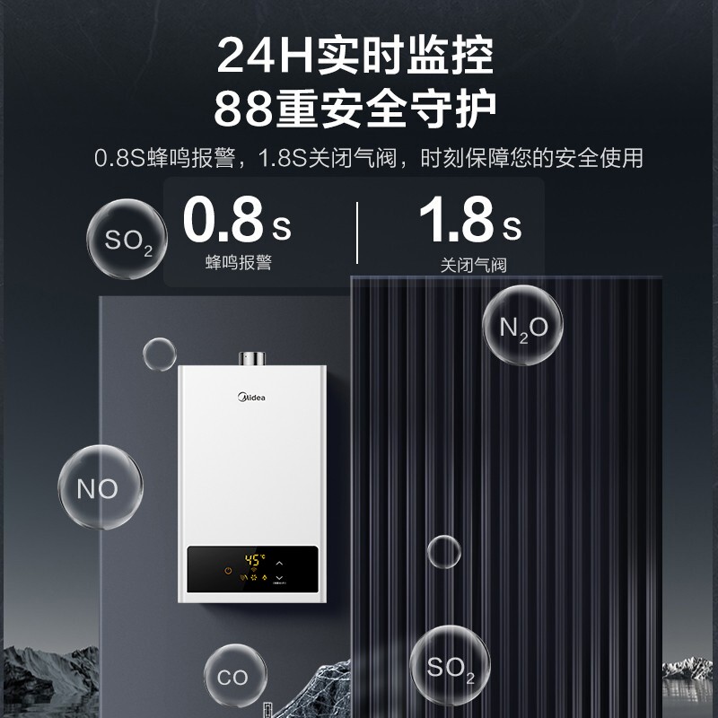 美的(Midea)这款型号为JSQ22-12HWF的燃气热水器,采用强制排气,无论运行时火是否点着,只要风机运行,尾气就能排出到室外。配合智能芯片,可实现对水温更加准确的控制,可根据水、气的变化自动切换风机运行转速,达到恒温出水,让沐浴不再忽冷忽热。水过滤装置,可过滤日常各种杂质,水流传感器,将水流信号通过电信号传递控制器进行点火。水气联动阀,如遇突然停水、停气状况,可用自动开关关闭燃气防止干烧。一氧化碳报警器,当监测到室内空气中一氧化碳溶度超过安全范围(150ppm),立刻声光报警切断气源。超低水压启动,保证高层楼房正常工作。