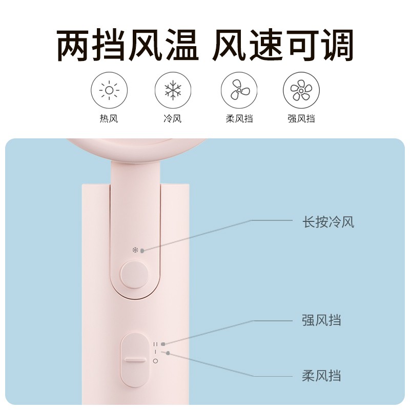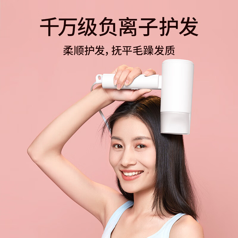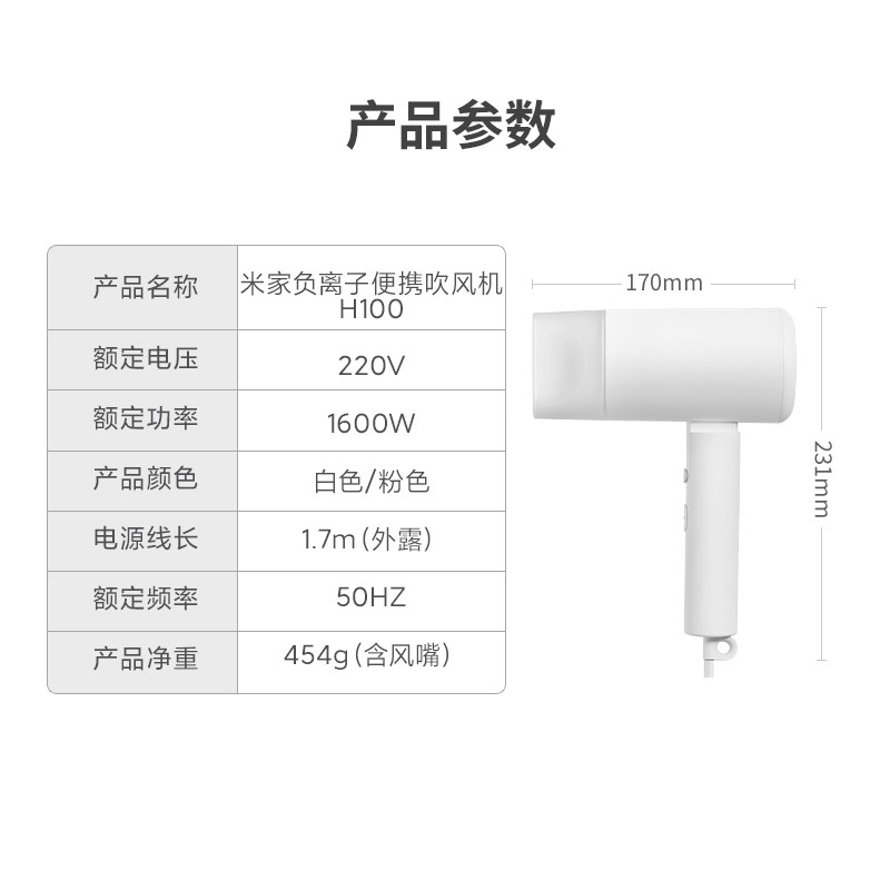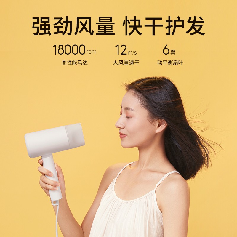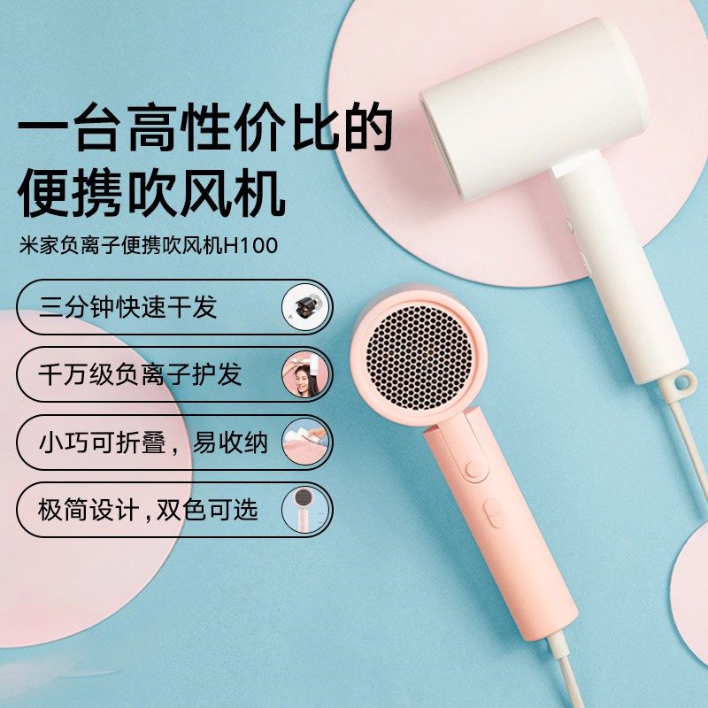 米家H100负离子便携式吹风机采用可折叠设计,两档风温,两档风速,具备过热保护、熔断保护。可释放千万级负离子,中和静电、抚平毛躁。电机转速高达18000转每分钟,风速最高可达12m/s,额定功率1600W,大风量快速干发。净重454g,负担更小。