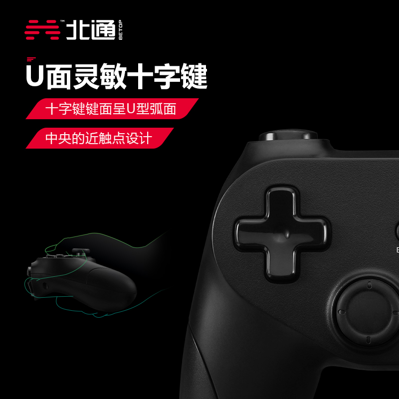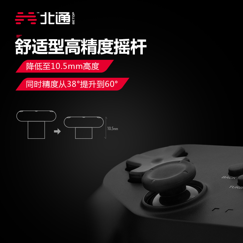 手柄十字键末端以四个压感胶球为支撑,键面呈U型弧面,中央下回处于大拇指腹自然贴合的近触点式设计,让方向键控制更加灵敏。装备了中型摇杆元配件,降低至10.5mm的摇杆高度,摇杄精度提升,细微操控,征服压力。同时BD2E还采用增强型体感震动方案,左右马达负载非对称设计,细地反馈游戏中不同场景轻重有别的震感,增强游戏剧情和场景的带入感。