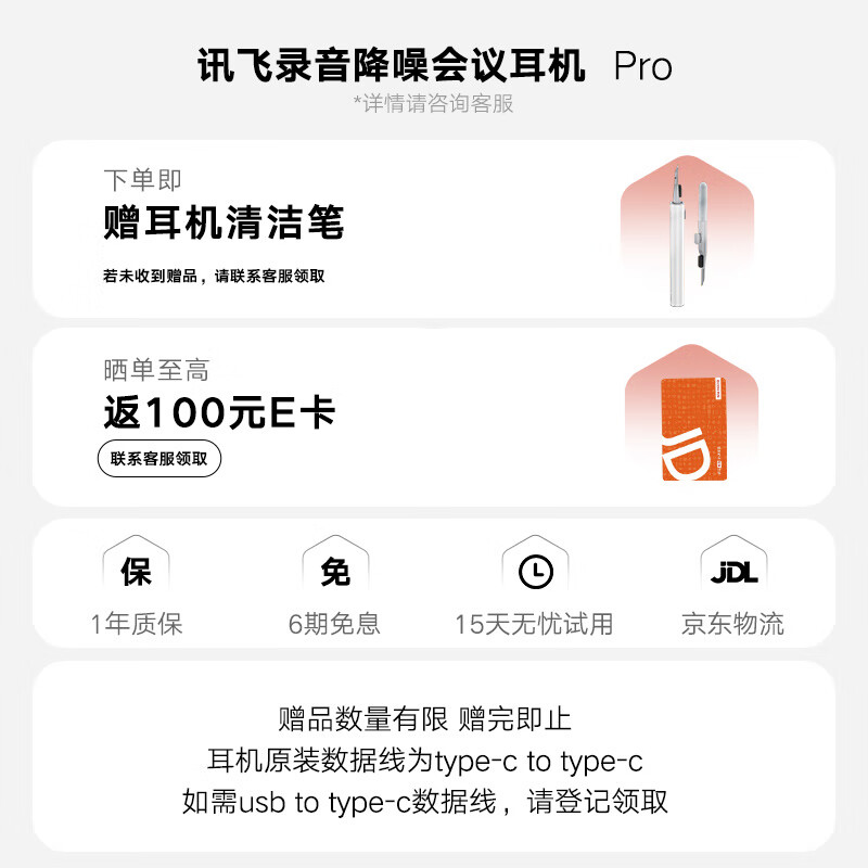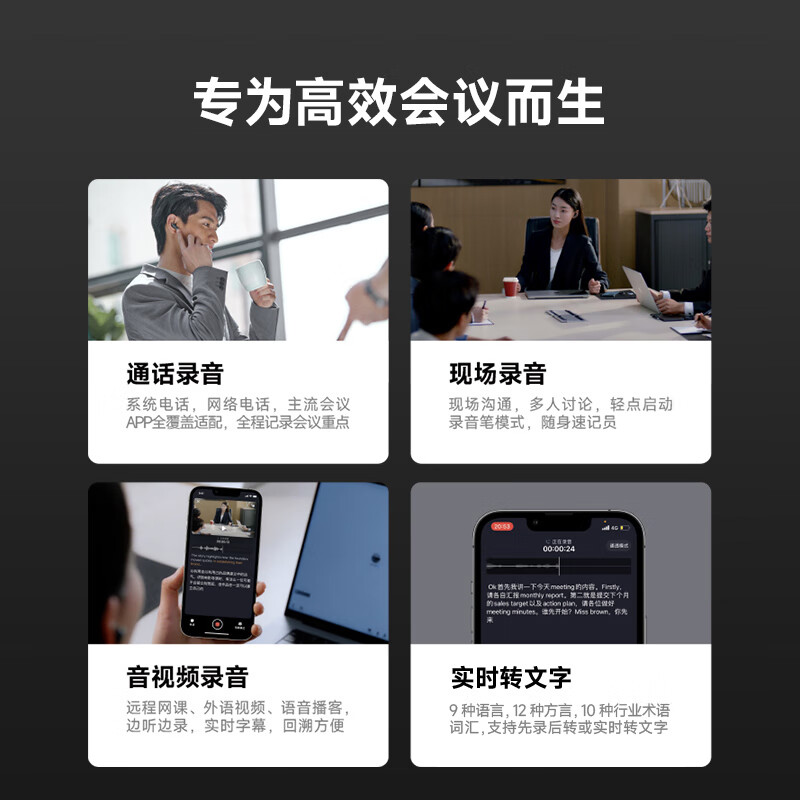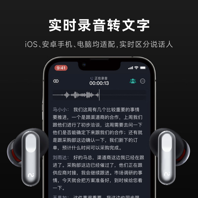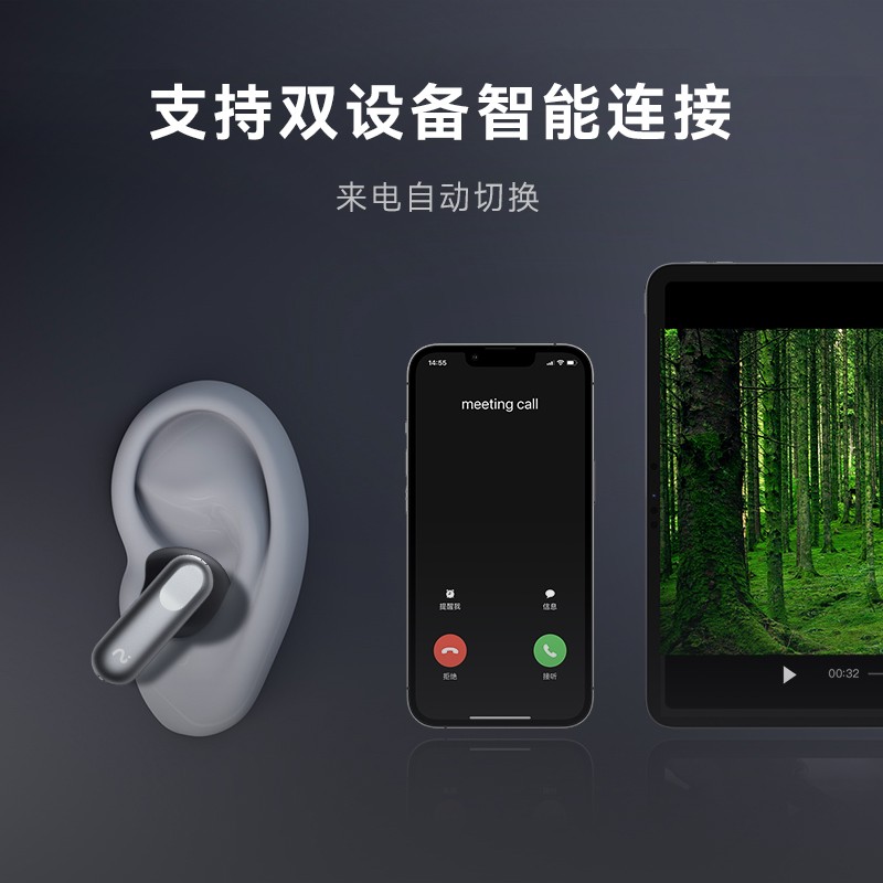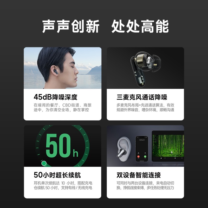 该款耳机支持通话录音,拥有三种录音模式,支持各种场景录音转文字,支持7种语言、12种方言、10种专业领域,字幕实时翻译。支持双设备同时连接。拥有45dB主动降噪,三麦克风通话降噪。配合充电仓使用,续航可达50h。HiFi级立体音效。IP5X防尘。