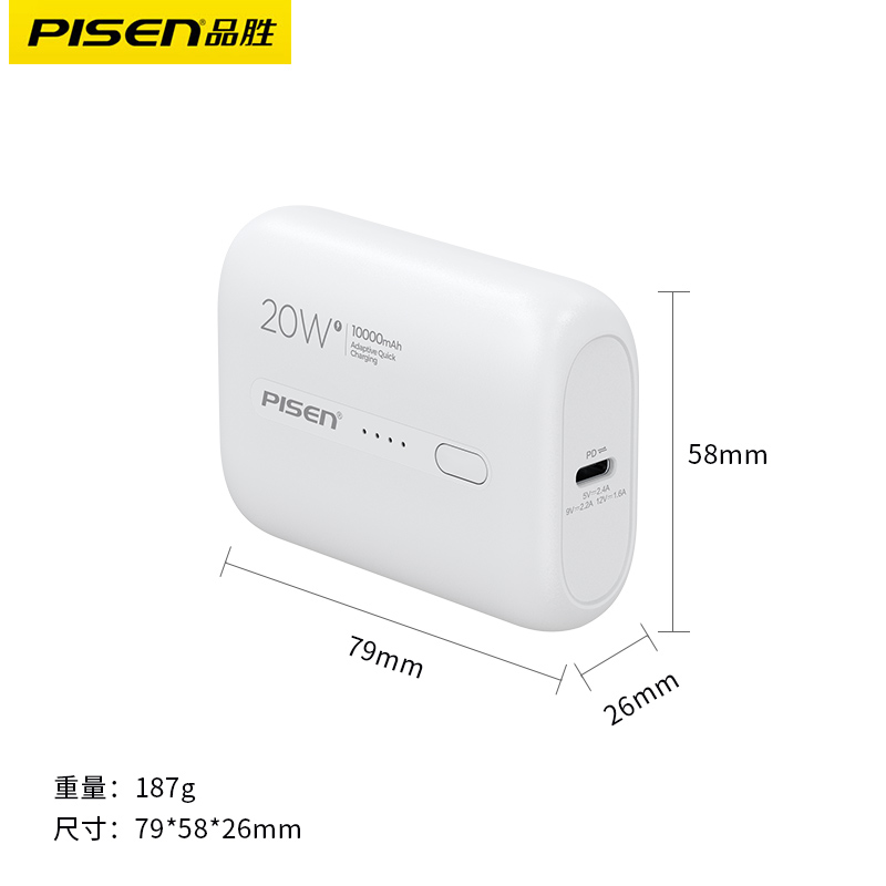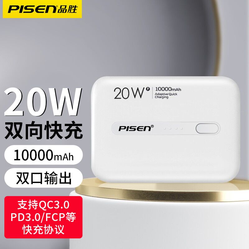 品胜此款充电宝,兼容QC3.0/PS3.0/FCP等快充协议,最高20W输出,拥有Type-C/USB-A双口输出,10000mAh容量,可爱卡通外观,体积小巧,约79*58*26mm,重量约187克。