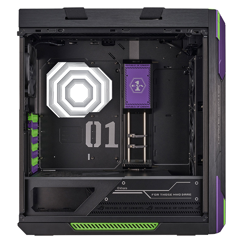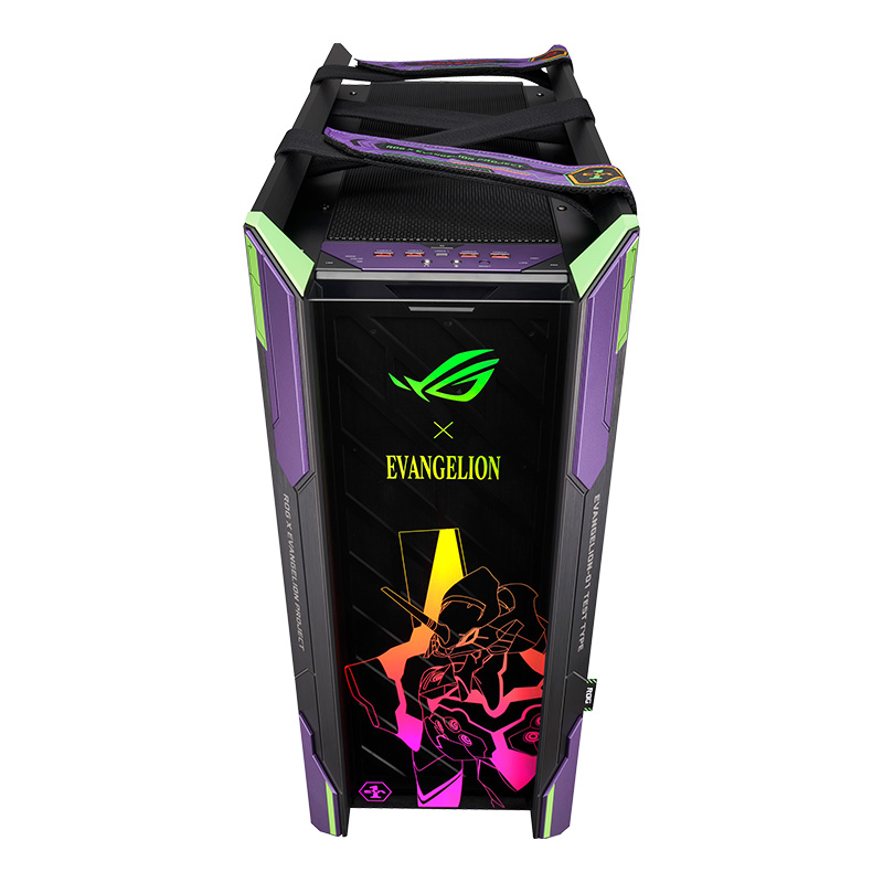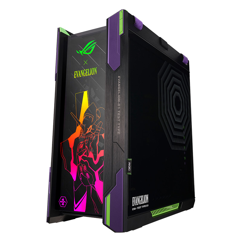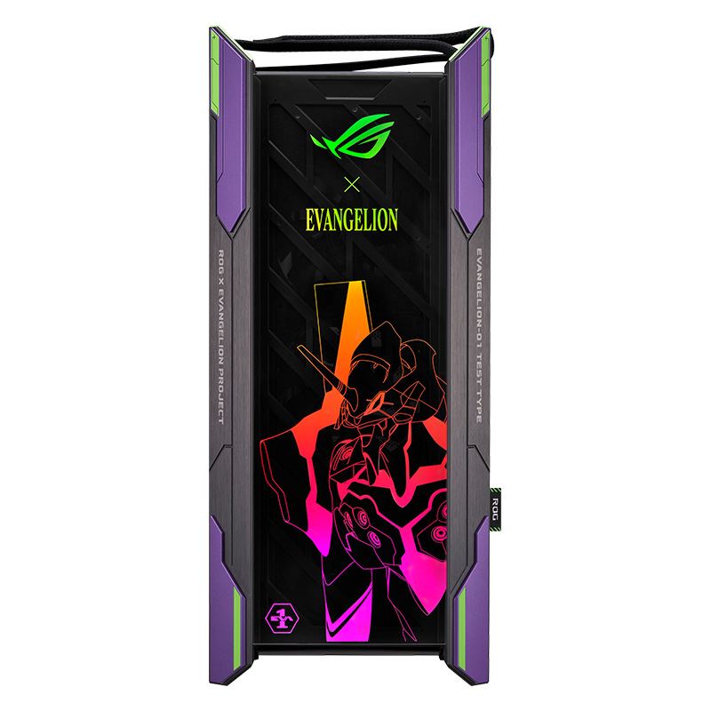 华硕 ROG GX601 太阳神机箱 EVA联名款整体尺寸为591x250x565mm,采用全侧透设计,配备三块4mm暗光钢化玻璃板,机箱表面采用拉丝铝合金材质。机箱配有多功能支架,可对显卡进行支撑,并且支持显卡竖装。配有散热和水冷排托架,便于安装理线。机箱顶部,前部和底部均配备可拆卸防尘网。
