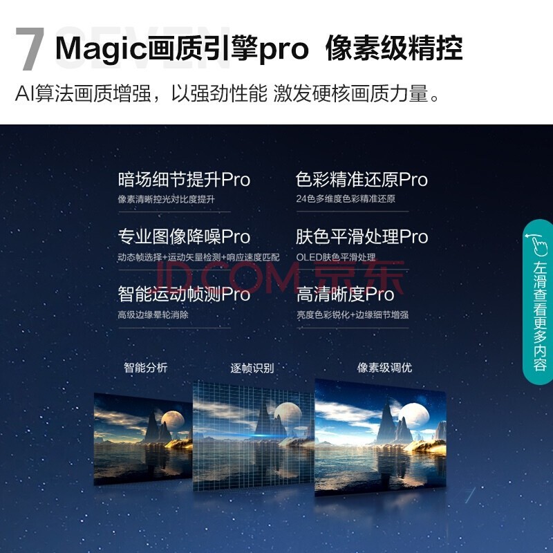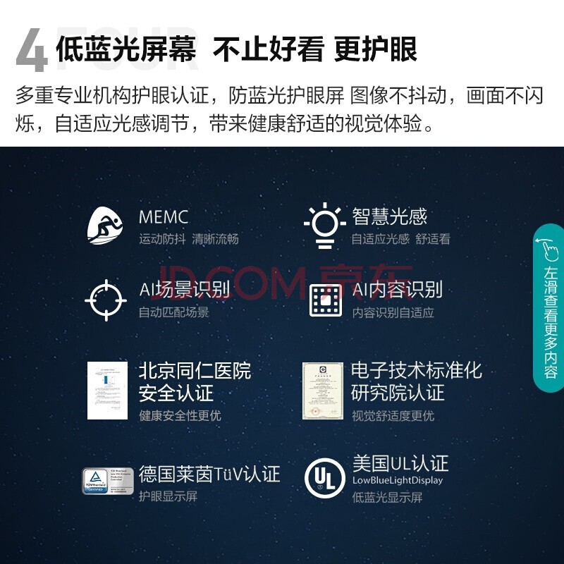 J70是海信的首款IMAX Enhanced认证产品,J70星河系列OLED实现了10bit色深、10.7亿色彩原色显示、135万:1的非凡对比度,以及178度广视角。J70的健康护眼特性也得到了德国、美国、中国等权威机构的认证。画质方面,海信J70搭载Dolby Vision,拥有更好的HDR效果和色域表现。支持137% BT709高色域和Δ E1.2专业色准表现,同时MEMC插帧让运动画面更清晰流畅。机内SOC采用四核A73架构,配合3G内存和32G闪存的配置,流畅满足各类App运行和4K视频播放,拥有Magic画质引擎Pro采用AI算法增强画质。音效方面,海信星河OLED电视采⽤IMAX Enhanced包含的DTS音效,在深度、重低⾳和动态范围上均得以优化,让⽤户在家中获得IMAX标志性的特⾊⾳效和沉浸感。