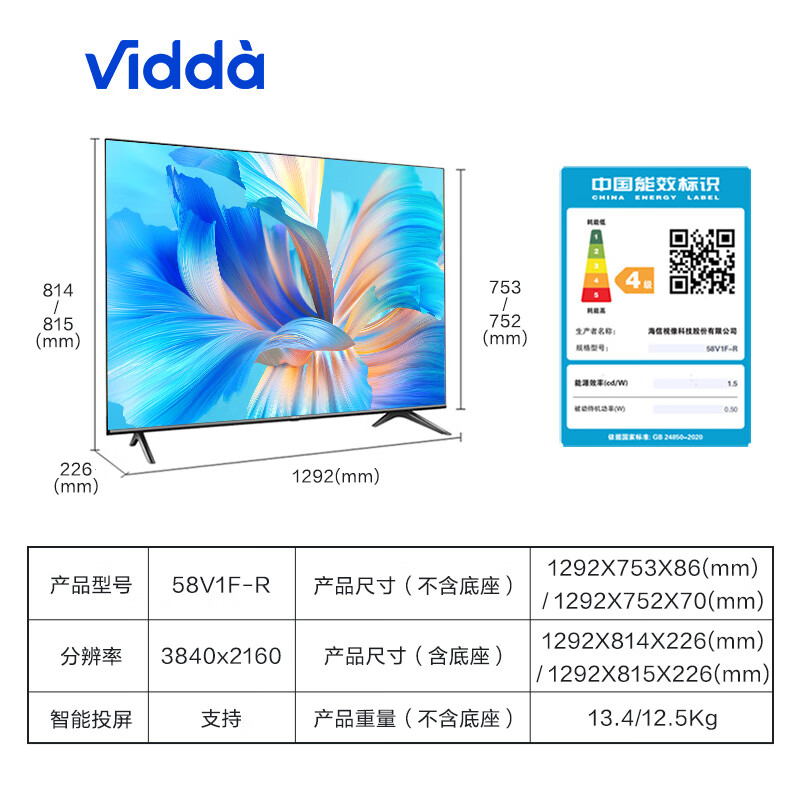 海信V1F包括V1F、V1F-R、V1F-S、V1F-PRO等子系列,其中热门机型70V1F-S,采用70英寸大屏幕,纤薄机身设计。自带VIDDA AI智慧系统,支持远场语音控制,可以多轮对话和进行深度搜索功能。这款电视采用了ARM Cortex-A73的双核处理器,搭配1.5GB+8GB存储配置,满足系统流程运行。4K+HDR图像处理技术,加入MEMC运动补偿芯片,三面无边全面屏设计,纤薄机身。蓝牙语音遥控,一键K歌,手机也可以变成遥控器,多屏互动。支持杜比+dts音效。