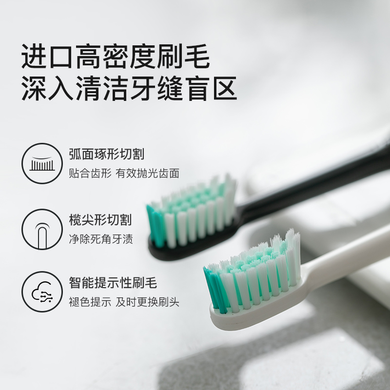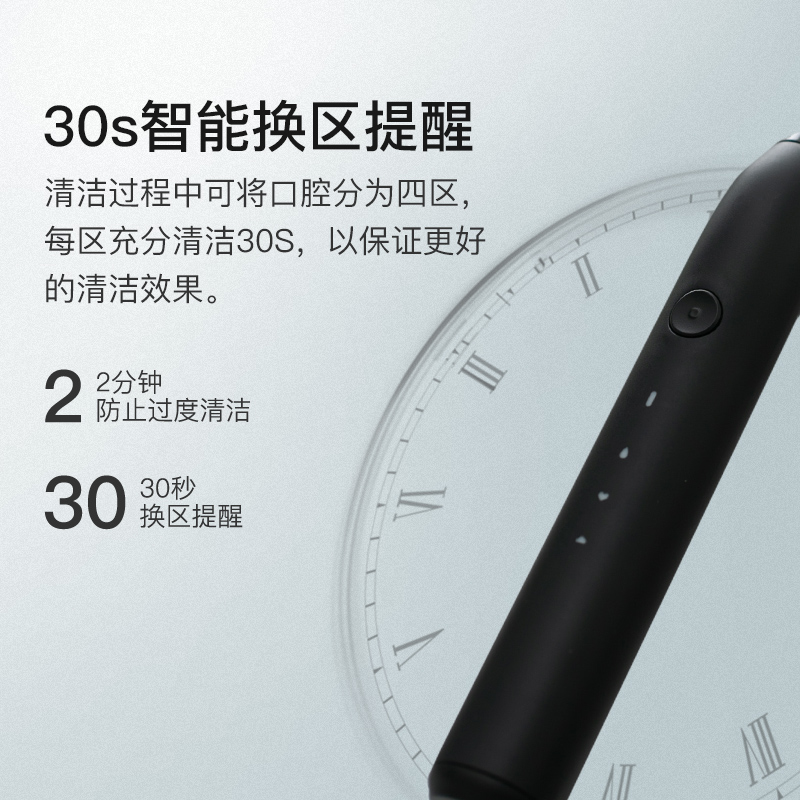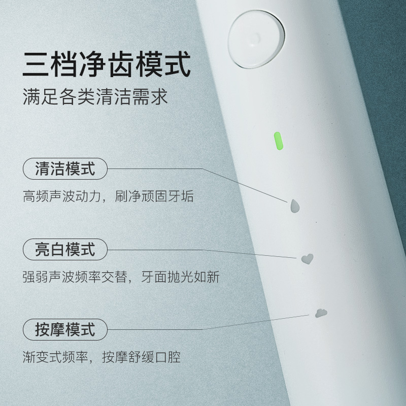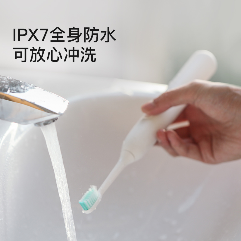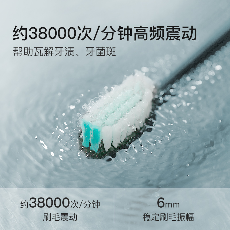 此款电动牙刷采用美国进口杜邦刷毛,榄尖形切割,更佳贴合口腔曲线,轻柔去除牙渍,同时护理牙龈。磁悬浮声波恒芯技术,每分钟31000次清洁。防水充电设计,2分钟智能定时,6mm宽摆幅,100g力度控制。按键采用包胶处理,更加防滑,机身采用哑光ABS材质。内部搭载锂电池,蓄电稳定更耐用,连续充电9小时候,电池可用14天(早晚各刷牙2分钟)。牙刷机身IPX5级防水,充电底座IPX7级防水。