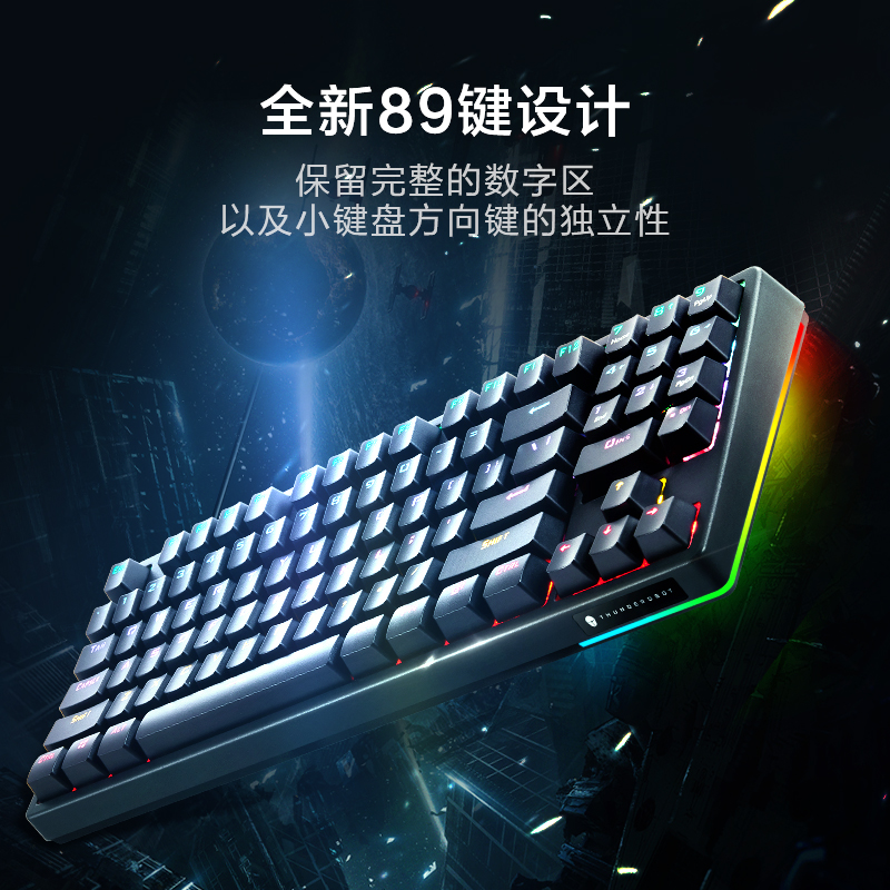 雷神KG3089C幻彩版 89键机械键盘,采用全新89键布局,保留了数字键区,保持小键盘方向键的独立性。采用L型炫酷RGB灯带,3组自定义背光模式+20种炫酷游戏灯效。KG3089C幻彩版采用注塑简约键帽,全键无冲。