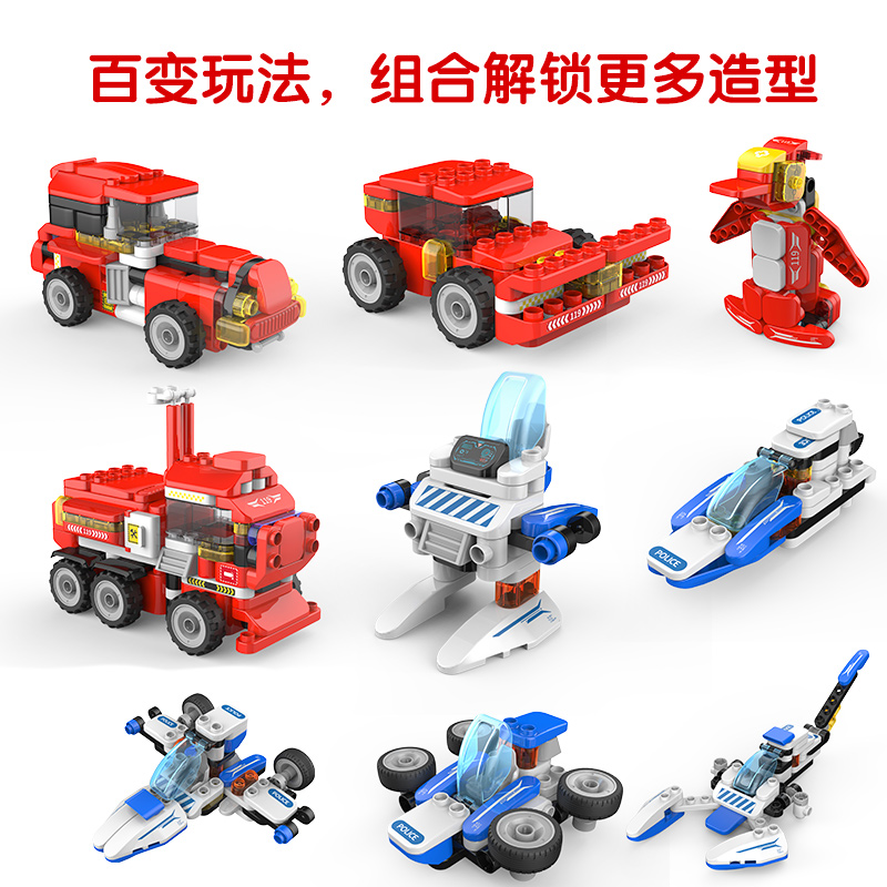布鲁可积木城市英雄系列61208百变两栖警用快艇采用水陆两栖造型设计,可旋转轮子可以快速在水陆模式中进行切换,前部救援绳索也能够伸长,标配的人仔也能放置在驾驶舱当中。除了两栖警用快艇之外,这款套组还可以变形成为机械战锤、侦察潜艇、巡逻游艇、急速战车、救援轮椅、弩与箭、巡逻战机、机械战蝎、战斗机器人和飞行汽车在内的10种变形模式。搭配61207百变巡逻警车套组,这款套组还可以组合成为超级光速追踪战机,进一步拓展了可玩性。该套组拥有70块颗粒,适合4岁以上儿童进行游玩。