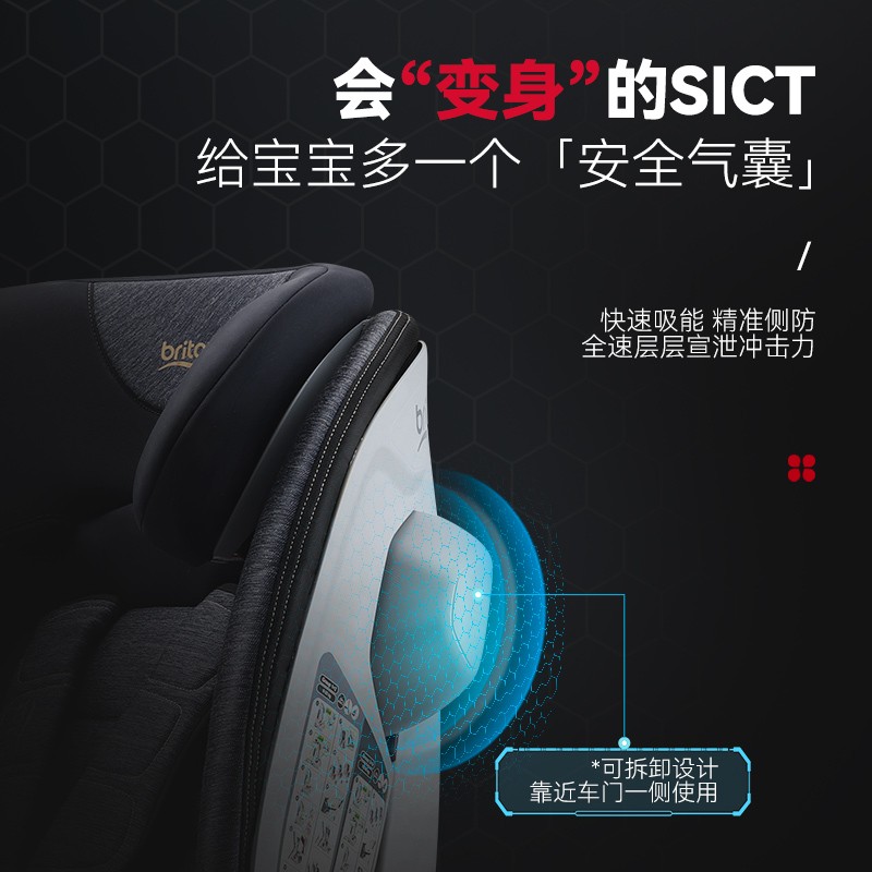 SICT-侧面防撞技术,可以根据座椅的安装位置,把移动式SICT装在靠窗的一遍,在发生侧面碰撞时,提供更好的安全保护,同时占用的车内空间是最少的。