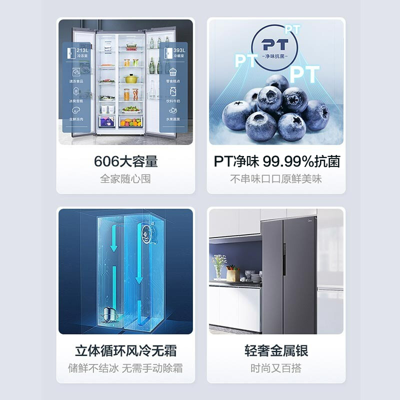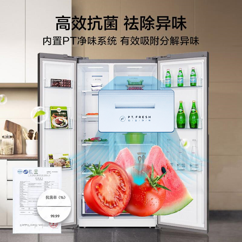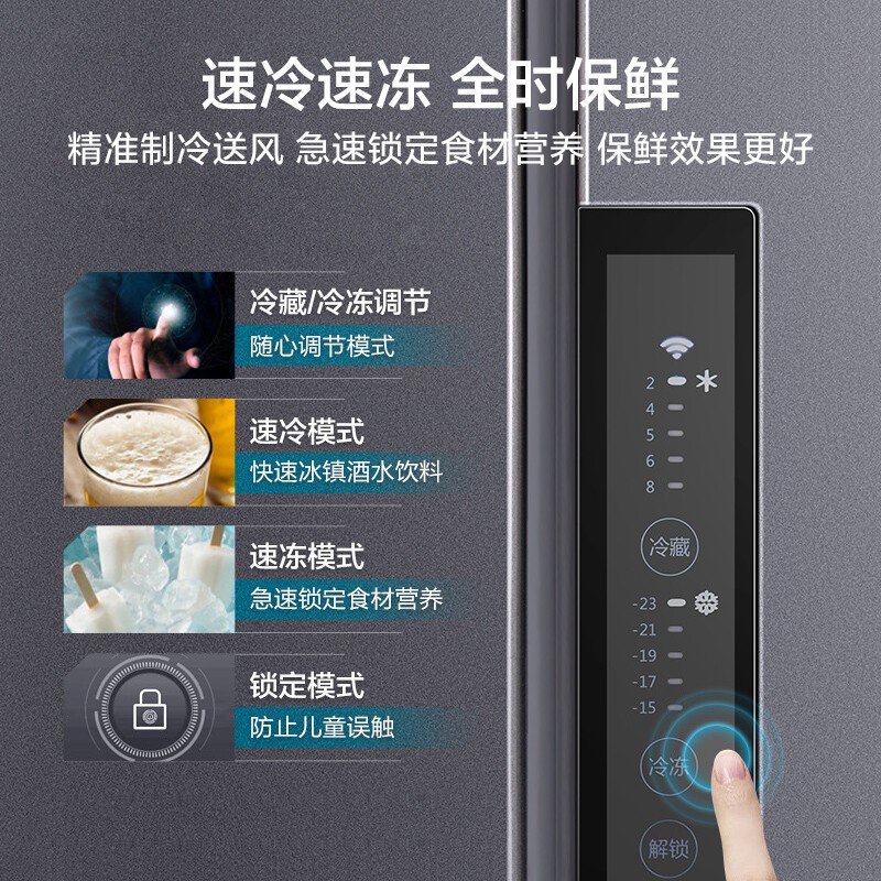 该系列冰箱采用了主流的对开门设计,冷藏冷冻双温区大容量,满足多样使用需求。冰箱制冷方式为风冷并使用了变频压缩机以及变频风机,控温更精准更加静音节能。该系列产品支持WI-FI智控,用户可通过APP实现远程操控。