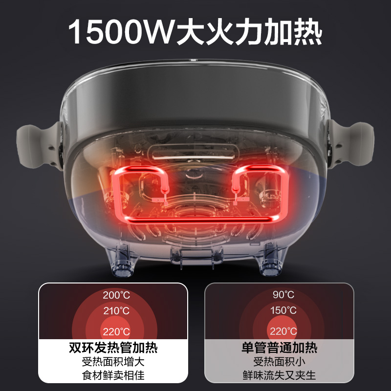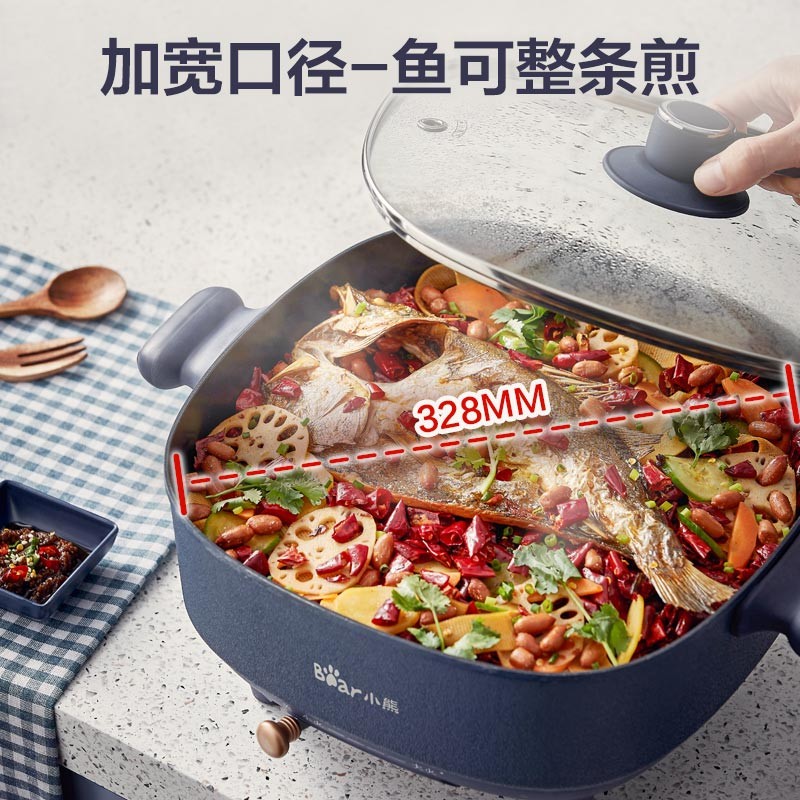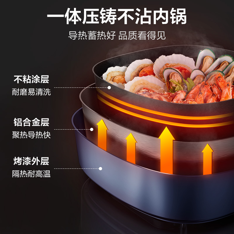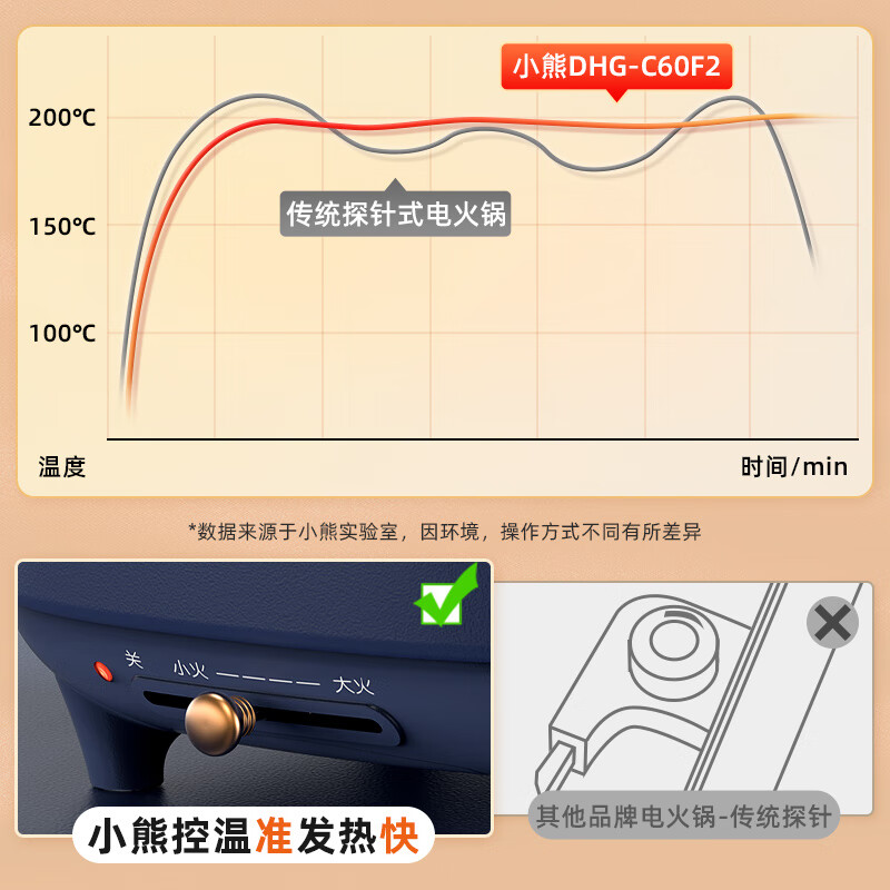 小熊 DHG-C60F2 电火锅,6升大容量,满足2-8人齐涮火锅。84mm深锅任性翻炒,食材不易溅出锅。0°C-210°C无级调节,烹饪途中随时控制火候。内置双环蝶形发热管1500w大火力加热。一体压铸不粘内锅,导热蓄热好不易糊锅。
