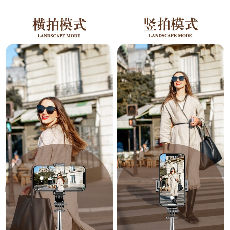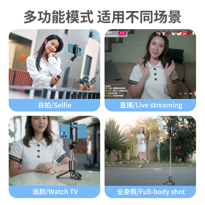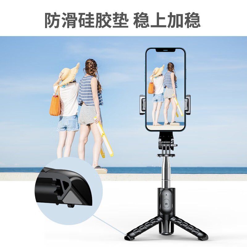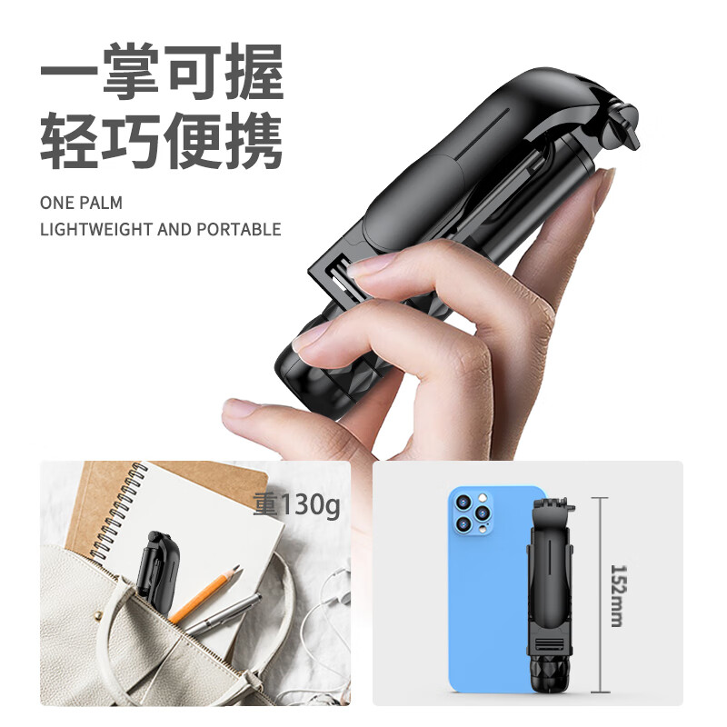 此款自拍杆,杆体采用铝合金材质,自由折叠,收纳后仅152mm,净重130g,一掌可握,轻巧便携。支持蓝牙无线远程遥控,自带三角支架,配备防滑硅胶垫,稳固牢靠。内置多功能模式,适用不同场景。