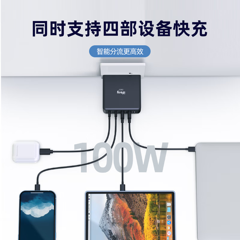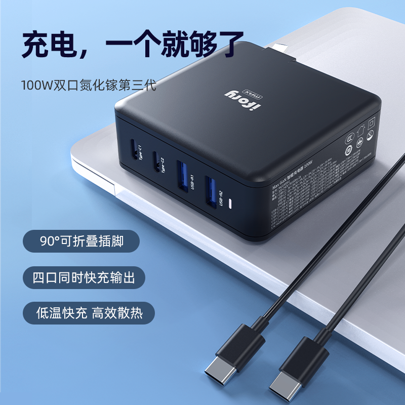 ifory 安福瑞四口氮化镓充电头,2个C口,2个A口,适配苹果系列手机,最高可达100W,采用第三代氮化镓,同时POWER S+技术,让充电更智能安全,功率更大,体积更小,散热更快;90°可折叠插脚,小巧便携,圆弧倒角设计,哑面与亮面结合,PC阻燃材质,手感极佳;充电器全协议兼容,支持PD快充,尺寸为75*75*28.7mm,重量约为200g,同时提供18个月质保。