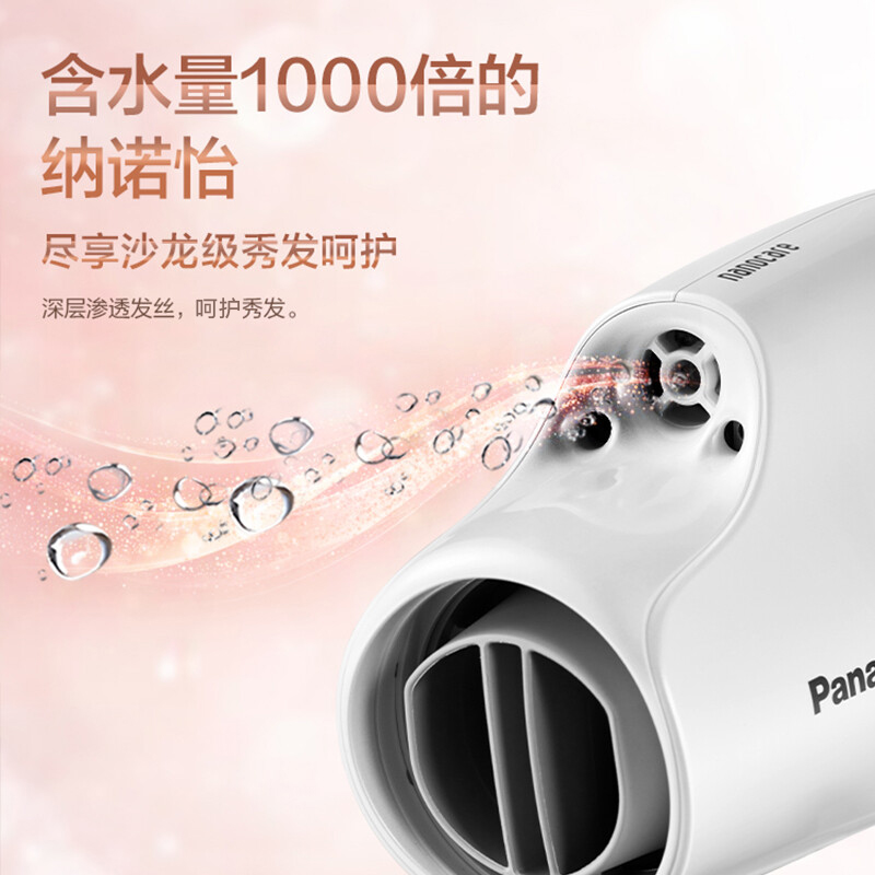松下NA9C系列电吹风外观方面沿用了以往造型设计,机身表层磨砂哑光材质凸显奢华质感。产品设计有3档风速调节,1档造型,2档吹干,3档速干。手柄背部设计有离子感应板,手持使用时感应板会形成感应回路,让离子更容易吸附在我们的头发上。进风口的位置采用了细密的滤网设计,有效地防止头发吸入。产品主打“空气水膜”,可吹风的同时释放「纳诺怡™」&矿物质负离子,双倍加持下可有效减少毛发分叉,抵御紫外线的伤害。此外,相比于普通负离子,纳诺怡™拥有高于其1000倍的含水量,为秀发注入水润能量,深层渗透发丝,滋润秀发。