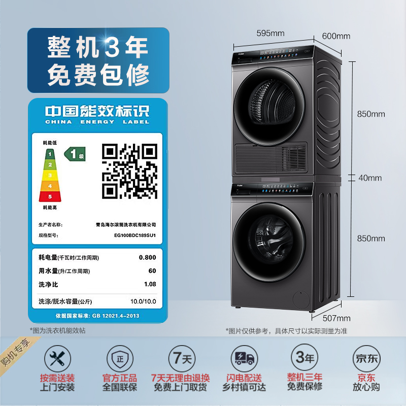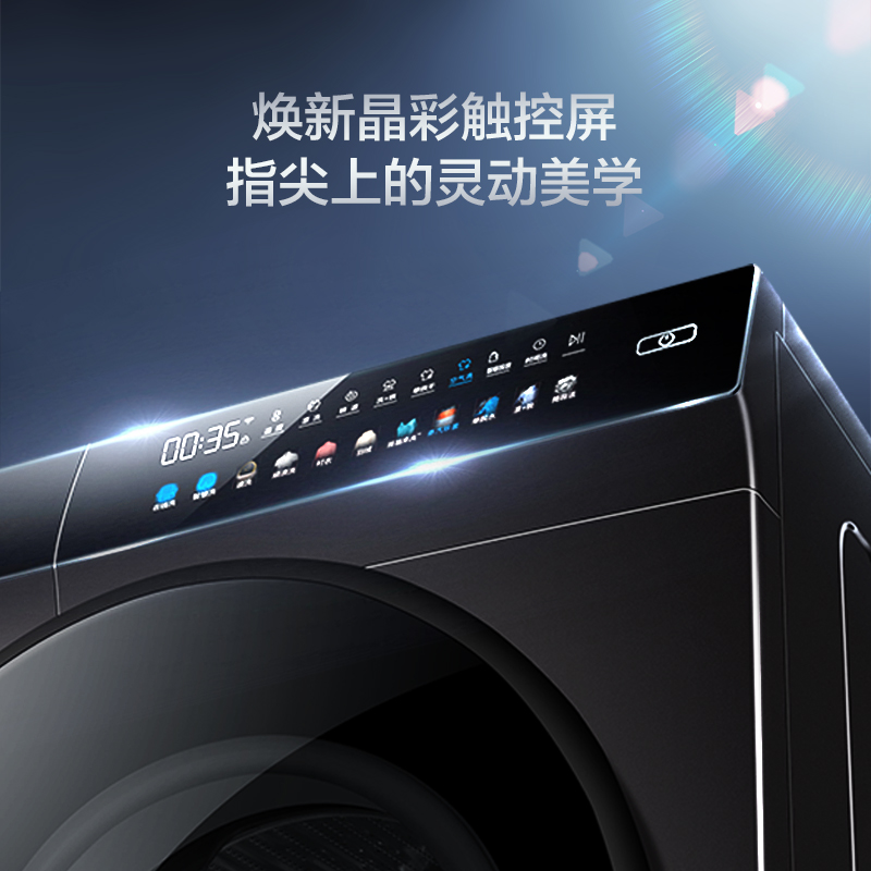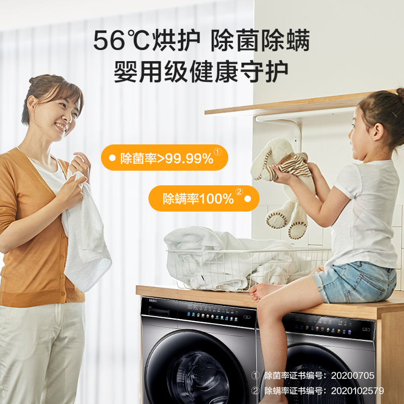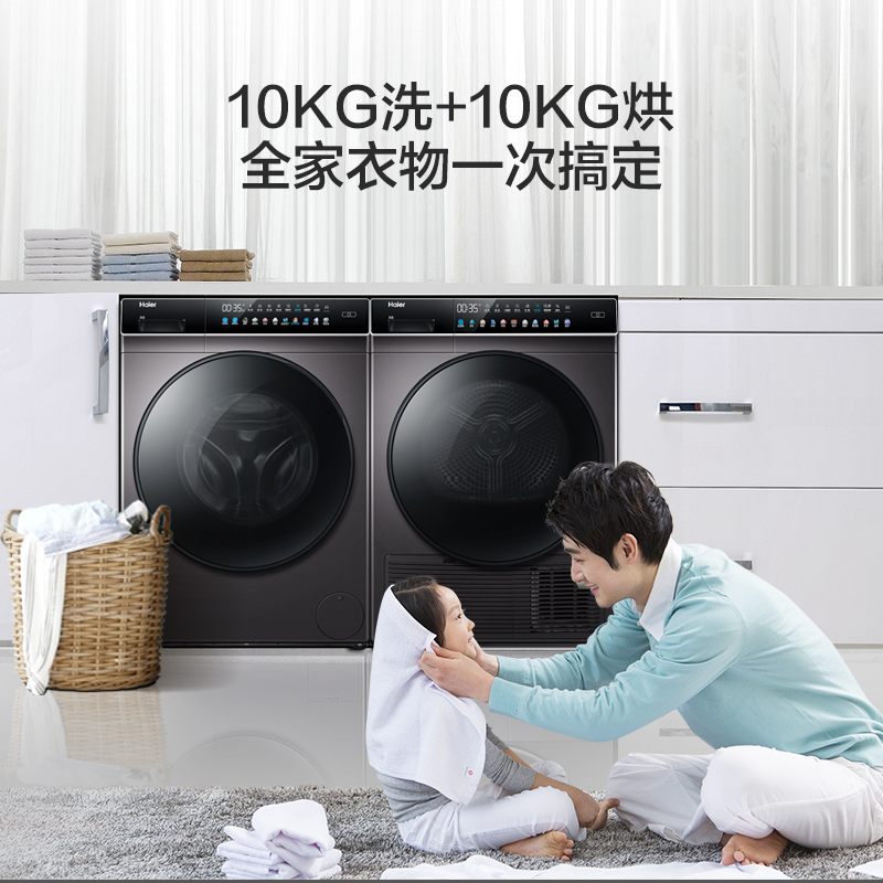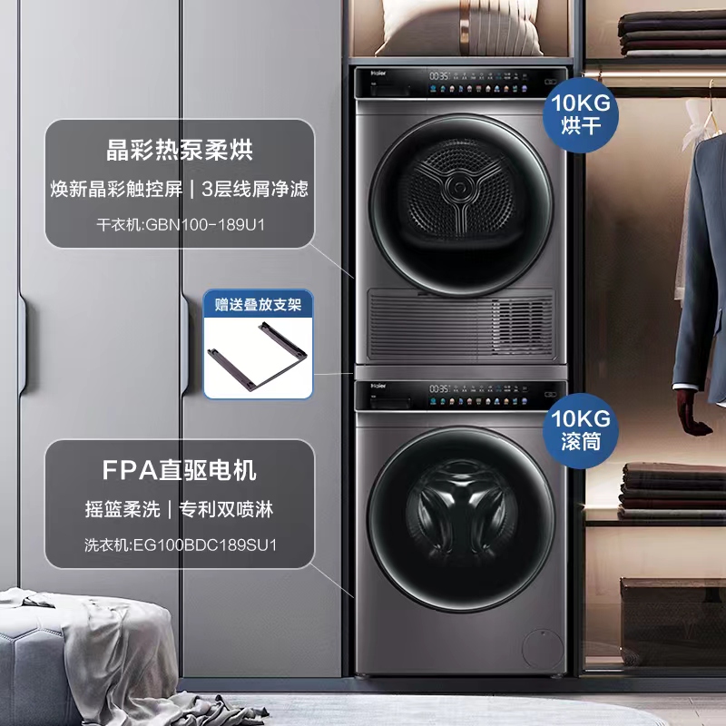 海尔 晶彩系列 EG100BDC189SU1+GBN100-189U1 热泵式洗烘套装,洗衣机搭载FPA直驱变频电机,智能精控到1°,动力强劲同时控制精准,能够实现摇篮柔洗。采用专利泵吸式智能投放,自动感知衣物重量,精控洗剂投放量,洗净同时减少残留。衣物香薰功能,利用高温蒸汽小分子,将香氛渗入衣物纤维,18分钟即可精致出门。60℃水洗杀菌,除菌率高达99.99%。干衣机采用低温热泵技术,整机功率550W,压缩机升温更快。内筒支持8:1正反转,有效防止大件衣物缠绕,减少褶皱。空气洗护理,利用蒸汽深入衣物纤维,高效去除异味和灰尘。56℃热风除菌除螨,除菌率高达99.99%,除螨率高达100%。三重线屑收集,高效清理衣物上毛屑,维持换热器清洁高效。
