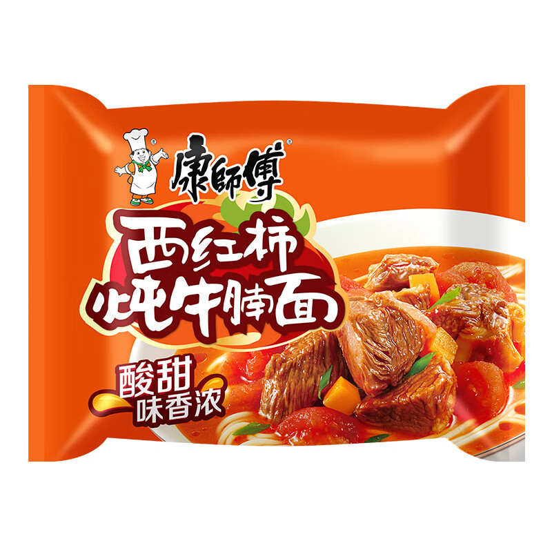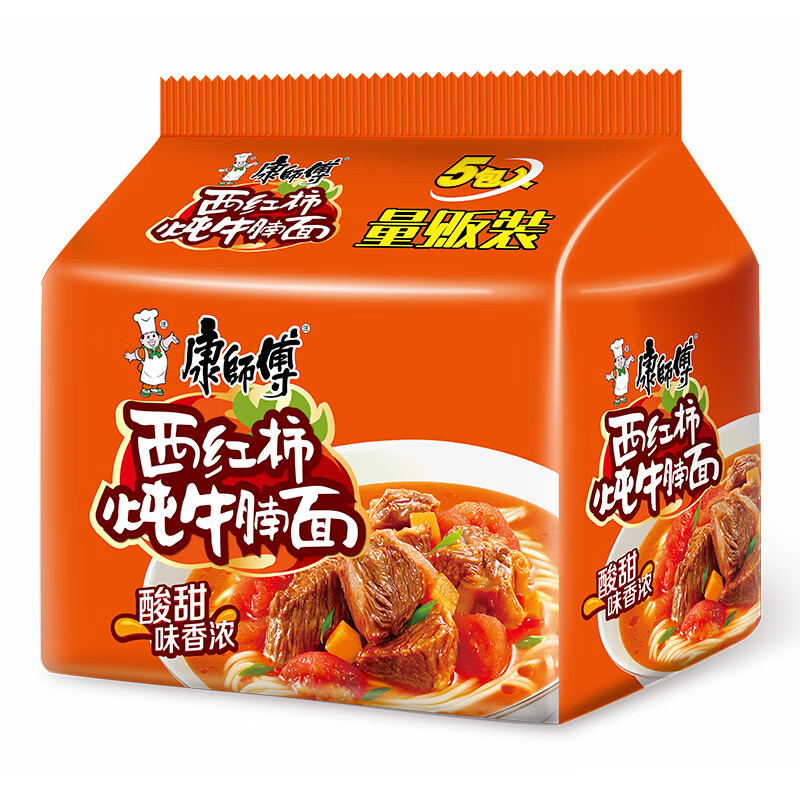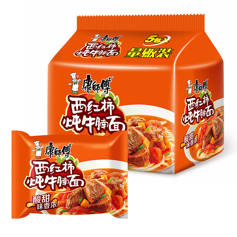 康师傅方便面(KSF) 西红柿牛腩面,番茄炖牛腩是餐桌上的经典菜肴番茄酸甜的香气刺激着味蕾,牛腩的厚实感充斥着口腔,味美汤浓、开胃爽口,热烈和满足在这一刻同时进发。规格:85g*5包。