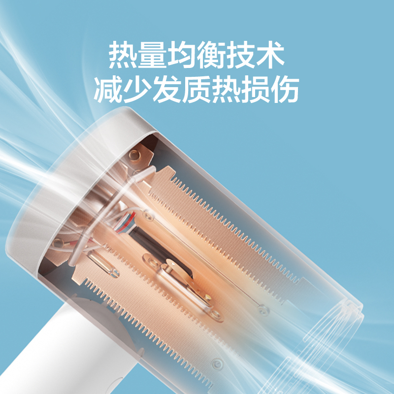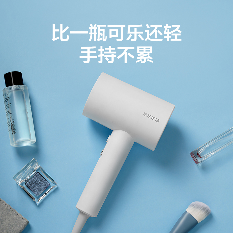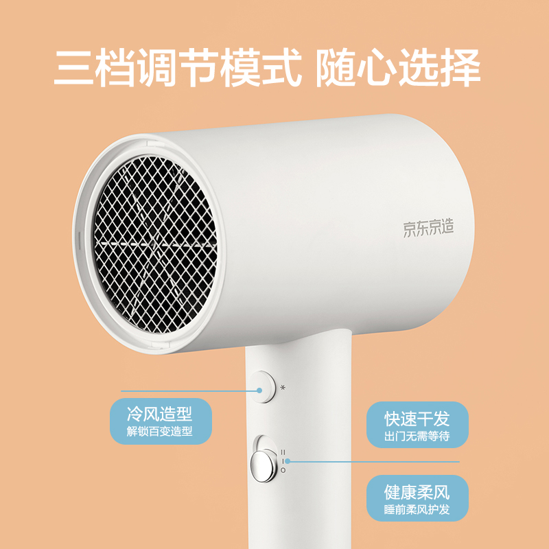 京东京造负离子电吹风机,1800W大功率强劲风量,内置负离子发生器,EHD热量均衡分布技术,6叶负压离心扇叶模拟涡轮进风口设计,有效降低噪音,三挡风温、两档风速设定,双层防烫风嘴设计,双重温控,机身隔热材质。
