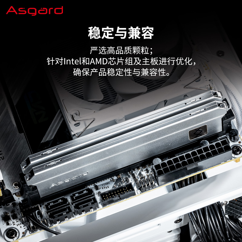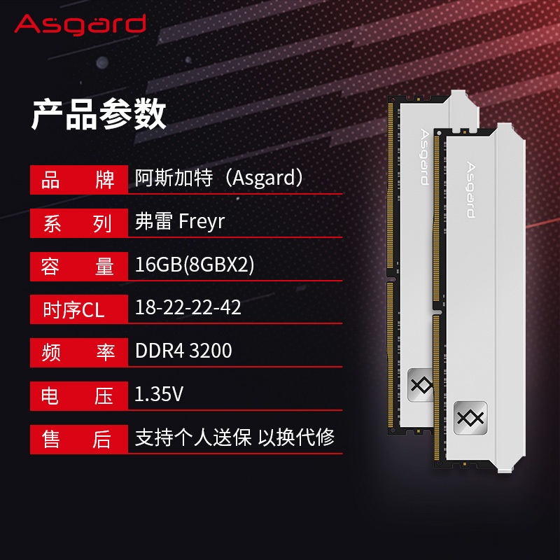 阿斯加特此款弗雷系列内存条,预置高频率规格选择,支持XMP2.0一键加速,使用相同内存模组,利用双根内存组建双通道。时序CL 16-20-20-40,容量16GB(8GB×2),DDR4 3299Hz频率,电压1.35V,达到了市面主流平台的全面兼容,带来更舒畅的使用体验。外观方面采用铝制外壳,银白色的散热马甲结合卢恩文字系列铭牌,带来强效散热的同时拥有更高颜值。