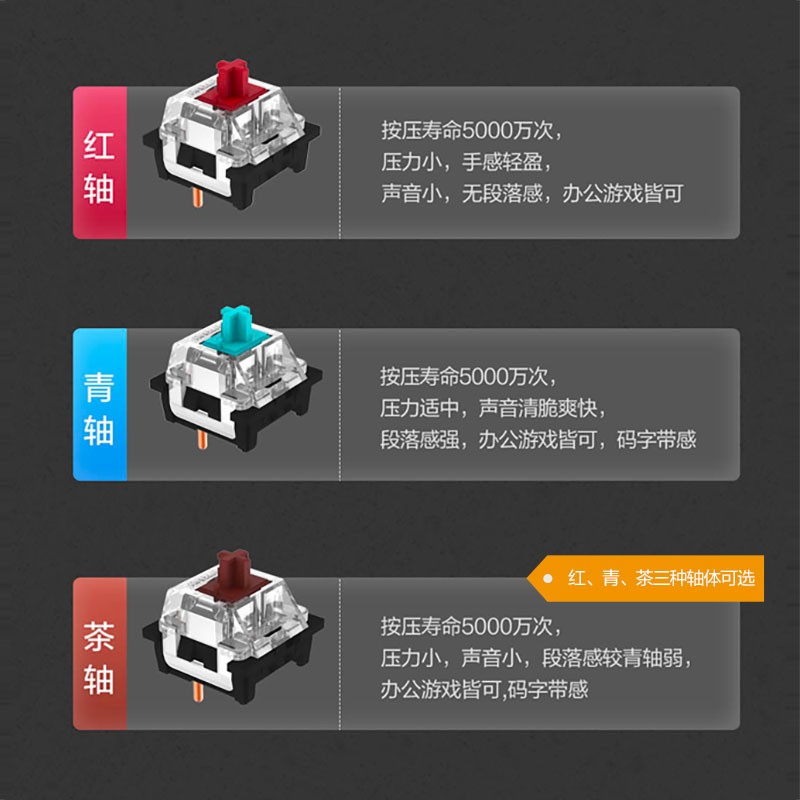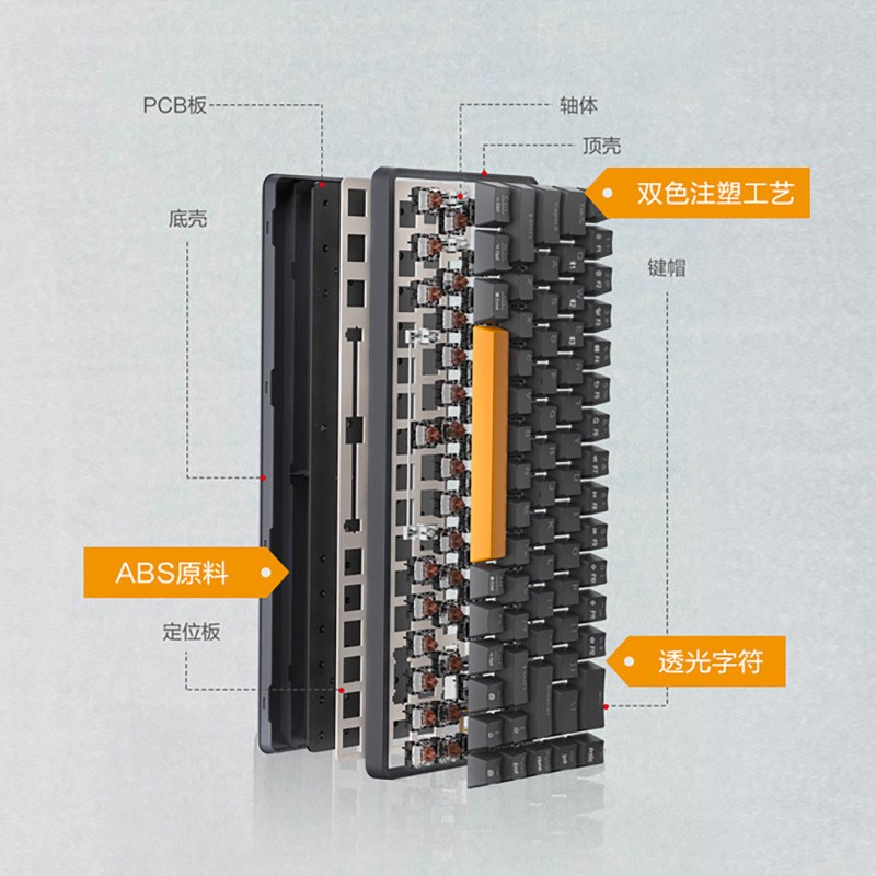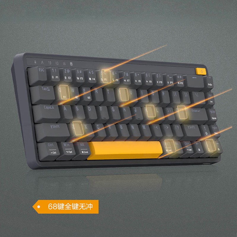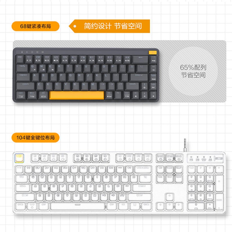 米物此款机械键盘,采用简约外观设计,68键位精简布局,蓝牙3.0/5.0、有线双模连接,可同时连接三台设备。拥有红轴、青轴、茶轴三种轴体可选,ABS键帽。兼容多种操作系统,USB-C接口,三段式脚架设计。