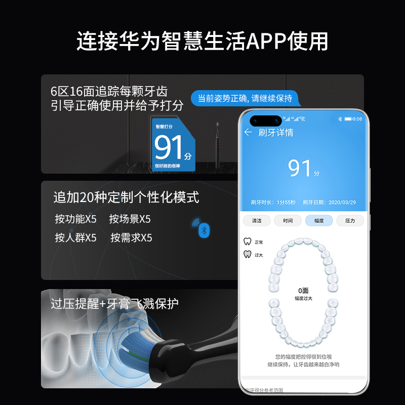 内部搭载7颗高性能芯片,更好地进行刷牙姿态检测,压力传感系统检测,内置6轴姿态传感器,将牙分为6区16面,通过连接APP即可实现实时引导,智能语音提示,4种模式,4种力度,2500毫安大电池,8H超长续航。