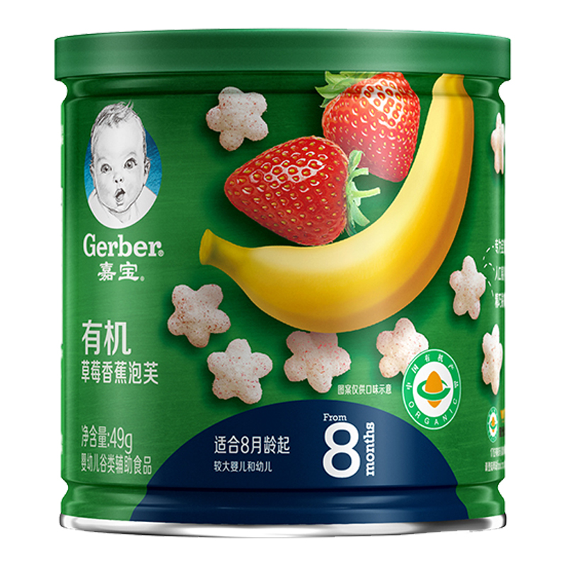 Gerber 嘉宝 婴儿有机草莓香蕉磨牙米饼,嘉宝有机草莓香蕉泡芙,中国有机认证,口味清淡不额外添加盐、白砂糖、香精、色素。专为宝宝设计,入口易溶易咀嚼,适应宝宝娇嫩口腔,帮助锻炼咀嚼能力。