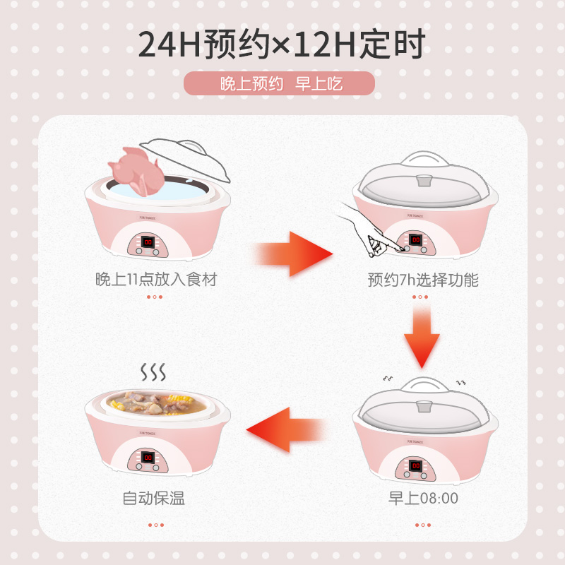 天际是国内专业做电炖锅的牌子,这款DDZ-16BW 隔水电炖锅最大容量为1.6L,带有不同大小3个白瓷内胆。额定功率为300w,多种模式可选,支持预约、定时,使用方便。