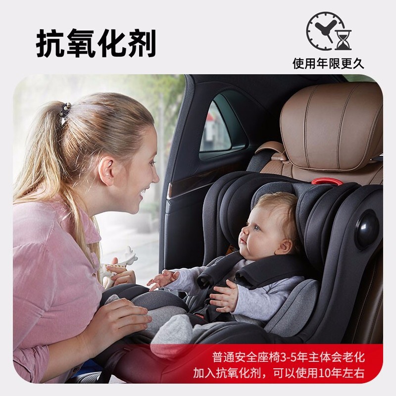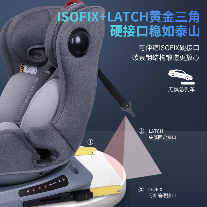 360°无限旋转,3种座椅随意切换,每90°悬停,4个卡点,妈妈带娃出门更轻松,165°可坐可躺可睡,舒适旅程;多档位调节,精刚齿轮耐用耐磨,使用寿命长,单手调节,单手按压拉拽可调节躺角角度。市场上90%的安全座椅采用价格低廉的平板布或乌眼布, 佳贝爱使用阳离子面料,成本约是普通面料的3倍。