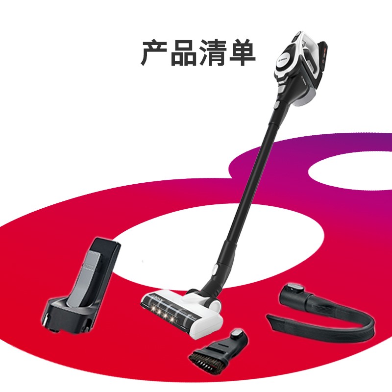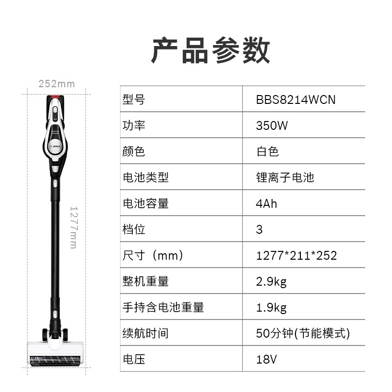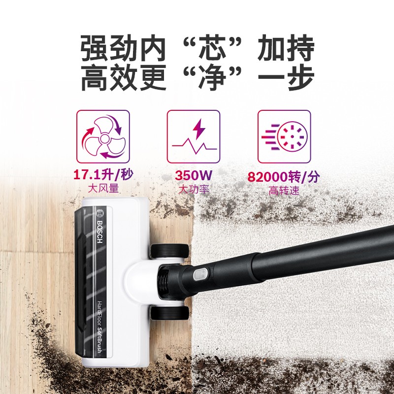 博世这款型号为BBS8214WCN的手持无线吸尘器属于新S8系列,采用原装进口的博世无刷直流电机,82000转/分钟高转速,拥有350W大功率;配备特殊设计的软绒地刷,支持180°转向,并且前置LED灯;具有3档清洁模式,包括智能模式、强劲模式和节能模式;内置BMS电池管理系统,电池容量4000mAh,支持51分钟即速快充;整机采用高度密封设计,从吸头到机身,所有接缝都高度密封,避免造成二次污染;采用了多重减震工艺,同时利用空气动力学实现无死角风道和优化马达,让机器运行时声音更柔和;主机自带吸嘴,即开即用,另外还配备了可深入狭窄空间的缝隙吸嘴、二合一组合刷等。