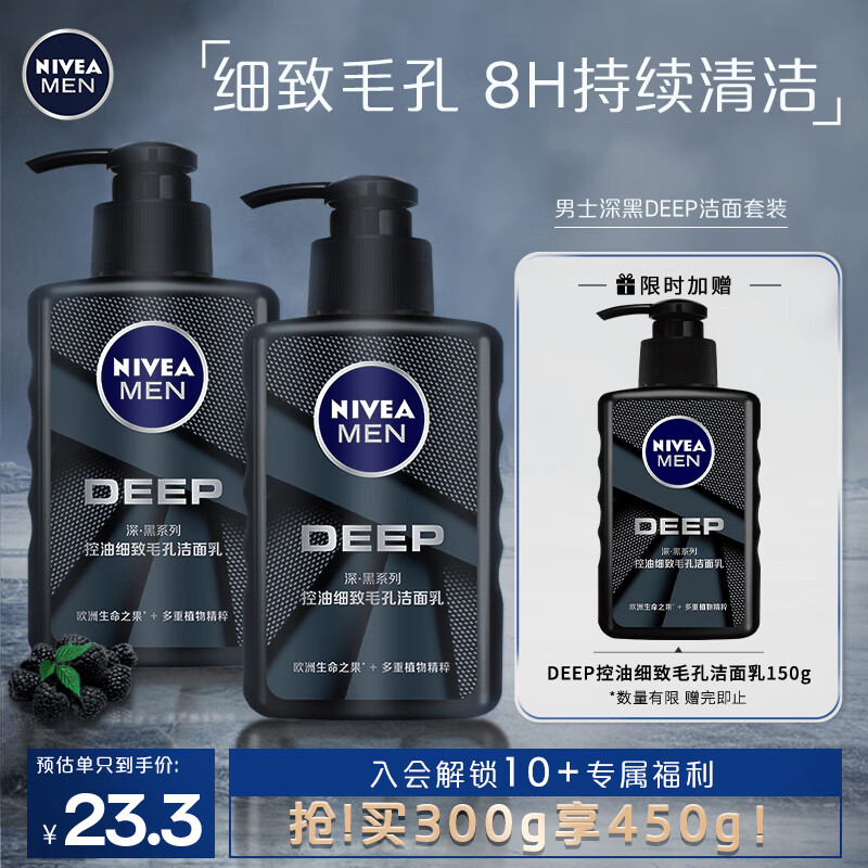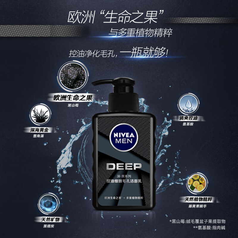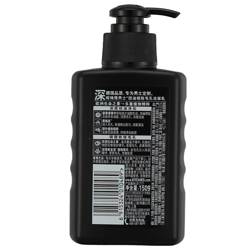 妮维雅(NIVEA)男士洗面奶150ml50g,妮维雅男士控油洗面奶,采用4D控油技术,添加藤黄果精华、卡尼丁、羟丙基淀粉磷酸酯等成分,可帮助分解多余油脂,清爽控油。含微米级清洁因子,结合温润配方,可温和控油,洗后不紧绷。淡化黑头,温和不刺激;采用采用德国按压式泵头,使用方便干净卫生。