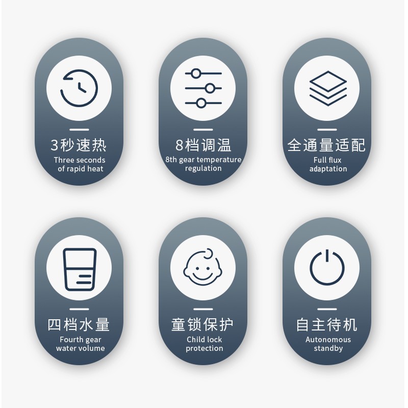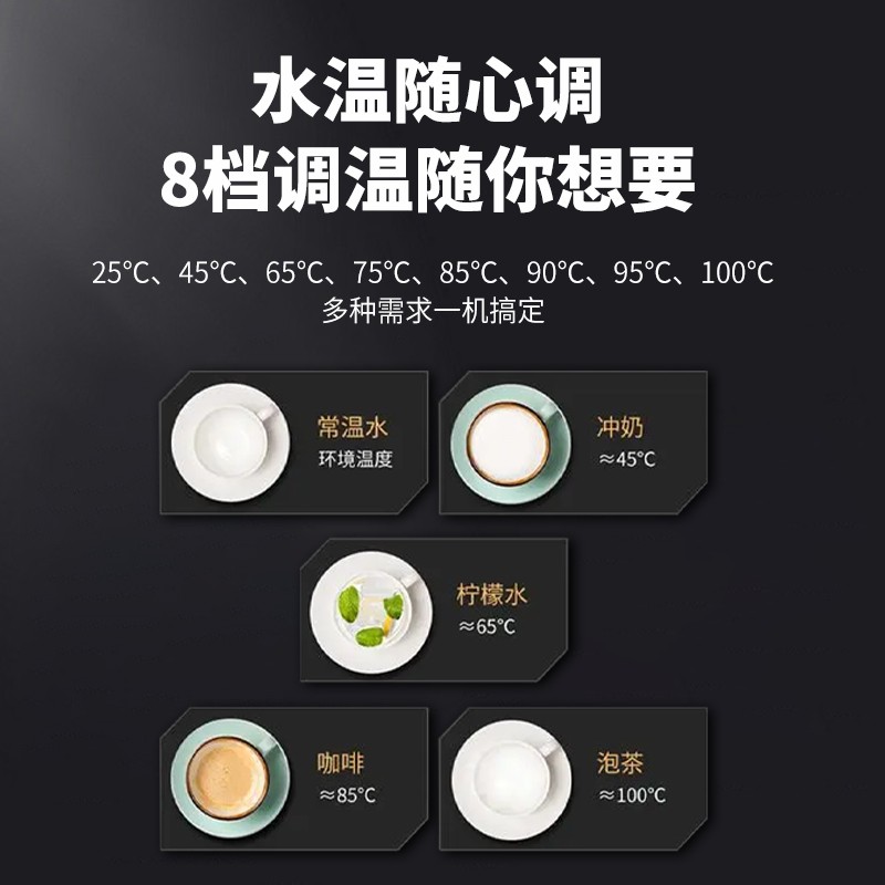 多档调温3秒速热,2000W大功率,100度沸腾只需3秒钟,拒绝千滚水,即饮不等待。水温随心调 8档调温随你想要,放下杯子选取指定水量后自动停止取水 无须担心水溢出。童锁防护 妈妈更放心,钢化玻璃面板 简约美观,低音补水。