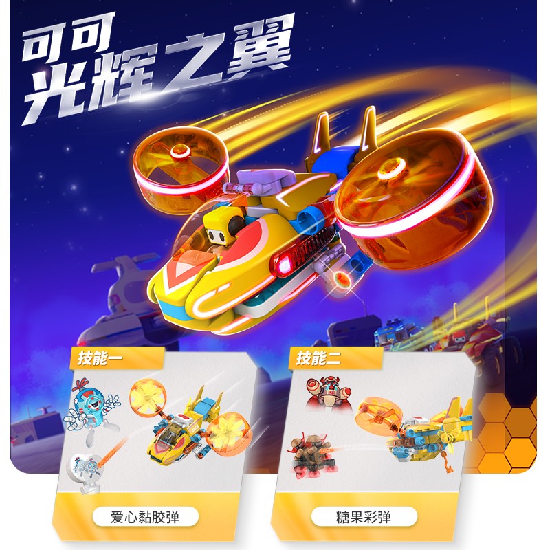 交通工具系列61127可可光辉之翼套组源于布鲁可战队动画IP中主角之一的座驾,拼插完成后是一台双旋翼飞机的造型。该旋翼机拥有两大作战技能,分别可以发射爱心黏胶弹和糖果彩弹。除了可可光辉之翼战机之外,该套组还有追击瑟丝蛋、飞弹三叉戟、深海探险号、高空追捕小队、光辉巡洋小队、蜻蜓侦察机、飓风推力快艇和黄莺机甲合计8种变形互动玩法。