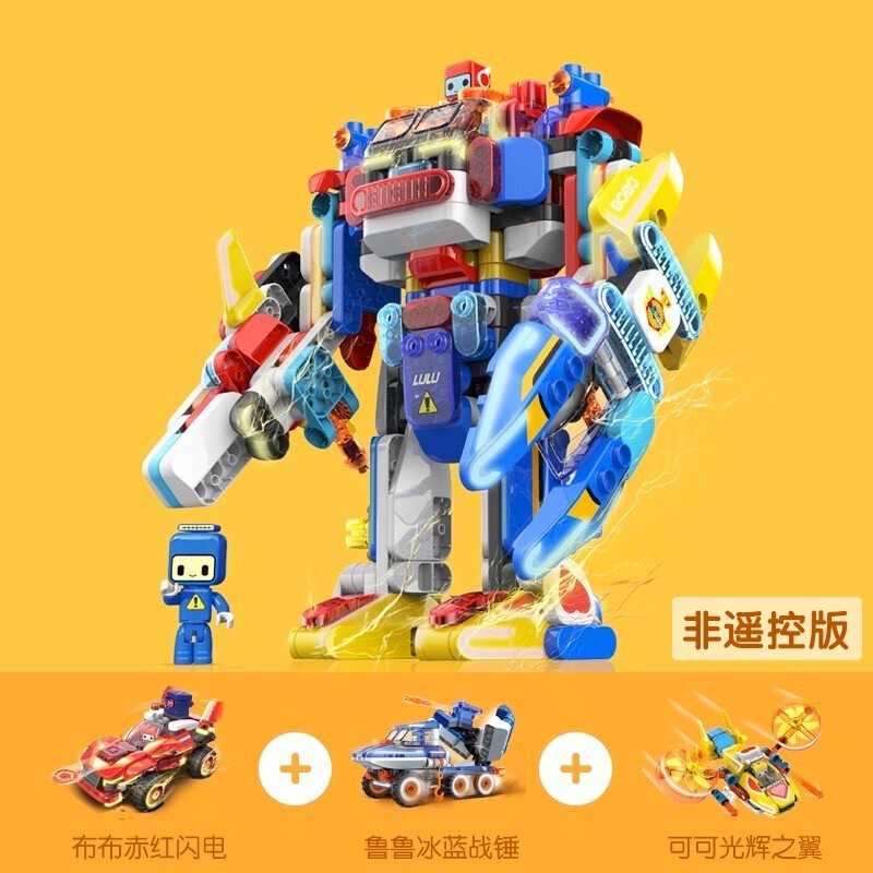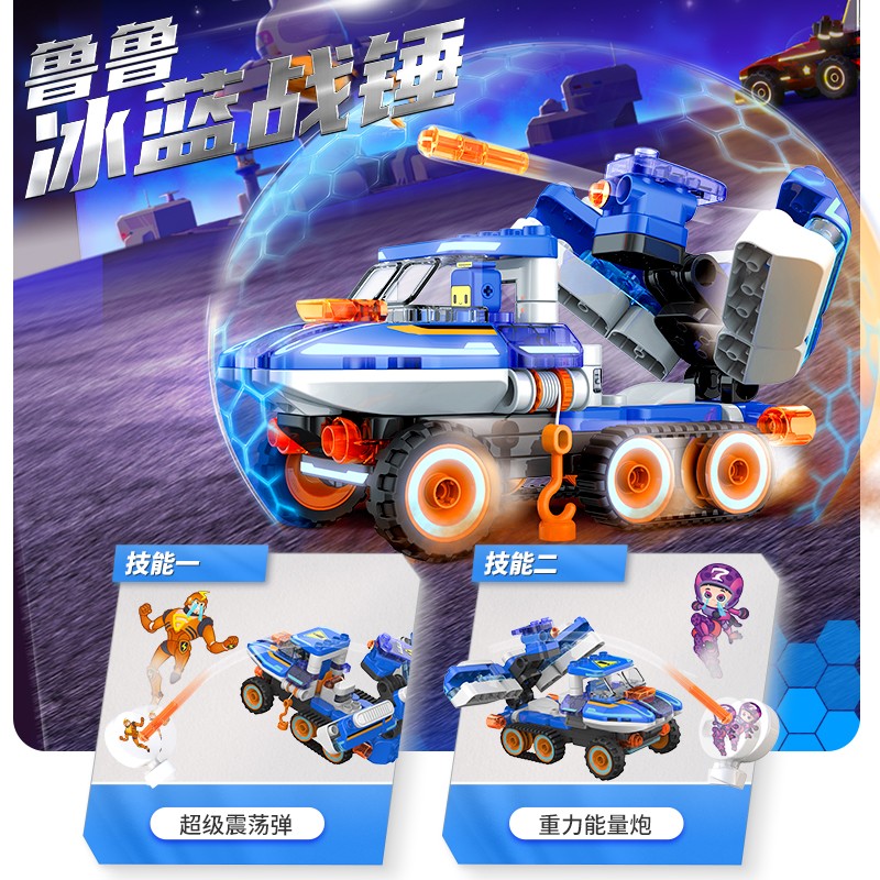 布鲁可积木交通工具系列61126鲁鲁冰蓝战锤套组是根据动画IP主角座驾进行设计,真实还原了动画中的作战场景。拼插的半履带战车具备有超级震荡弹和重力能量炮两大作战机能,充分还原弹射作战场景。除了拼插成半履带战车之外,还有多达8种不同类型的变形玩法。