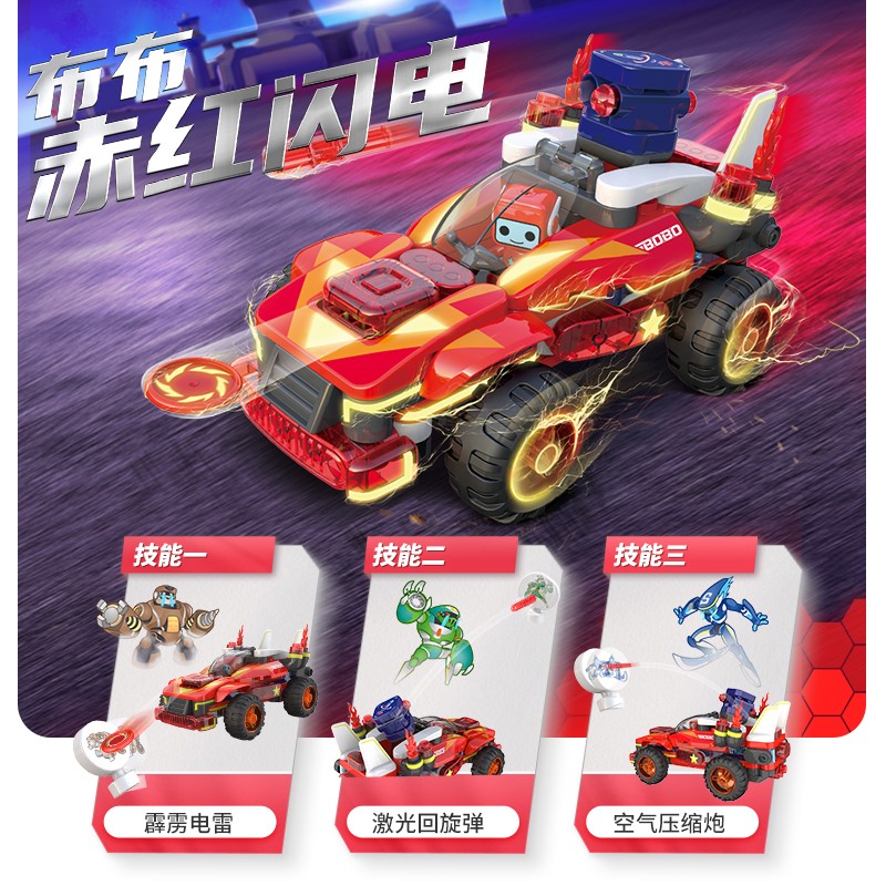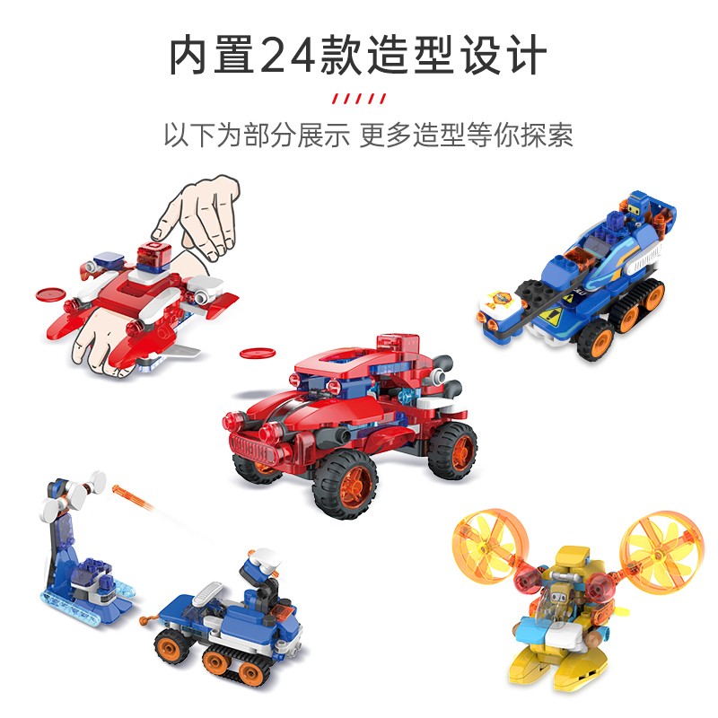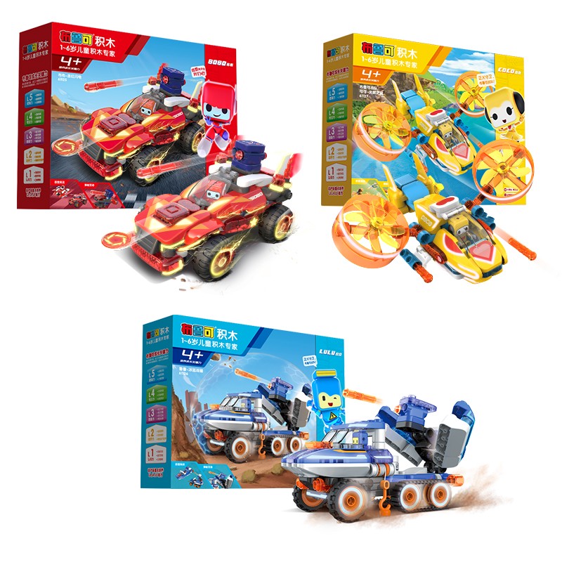 本款布鲁可套装为动画同款,包含三种交通工具系列积木组合而成。包括61125布布赤红闪电赛车(124颗粒)、61126布布冰蓝战锤导弹车(129颗粒)、61127可可光辉之翼飞机(136颗粒)。布鲁可积木交通工具系列61125布布赤红闪电套组,还原了布鲁可战队动画IP中的主角座驾之一,造型炫酷。拼插完成的车辆可以发射圆形飞盘、弹射“激光回旋弹”和“空气压缩炮”,还可以变形为高射炮训练、飞盘手弩、全地形越野霹雳战车、海底探险、攻击快艇、烈焰大脚战车、螳螂机器人和霹雳战斧合计8款变形设计。
