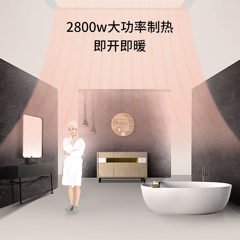此款采用日本Nidec直流电机,变速低噪,功能无极变速,自然柔风吹拂,低音换气,远超传统交流电机,电能转化效率高,动力强劲运行安稳,节能环保,2800w大功率制热,1min升温速热,PTC模块,间距排布,热气涌流不干扰,暖意直达浴室不衰减,360°四面环吸进风,热流高效巡航隐藏侧进风风道,相比传统正面进风口,进风风量更大,175mm大风道螺旋设计,大口径高速风轮,配合阿基米德螺旋风道设计,风阻小,暖风有效巡航,橫向送风,风轮越大,风道越精细,加热速率加倍。