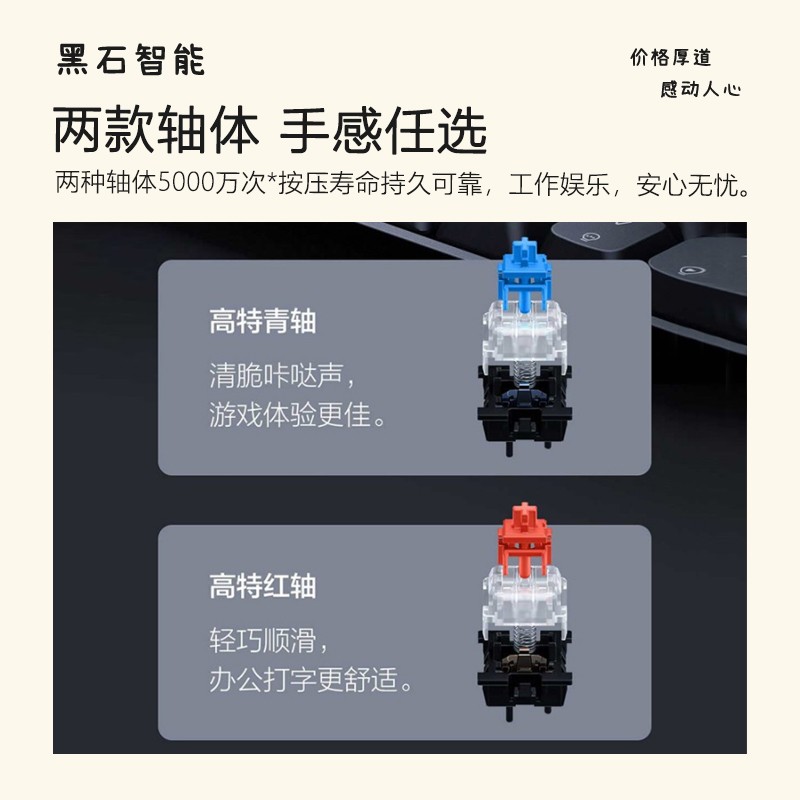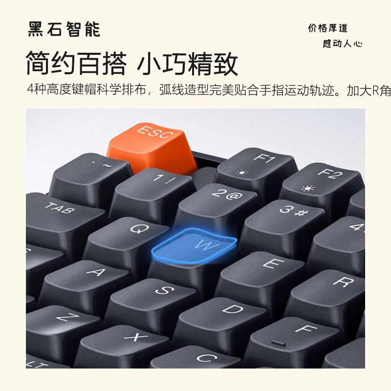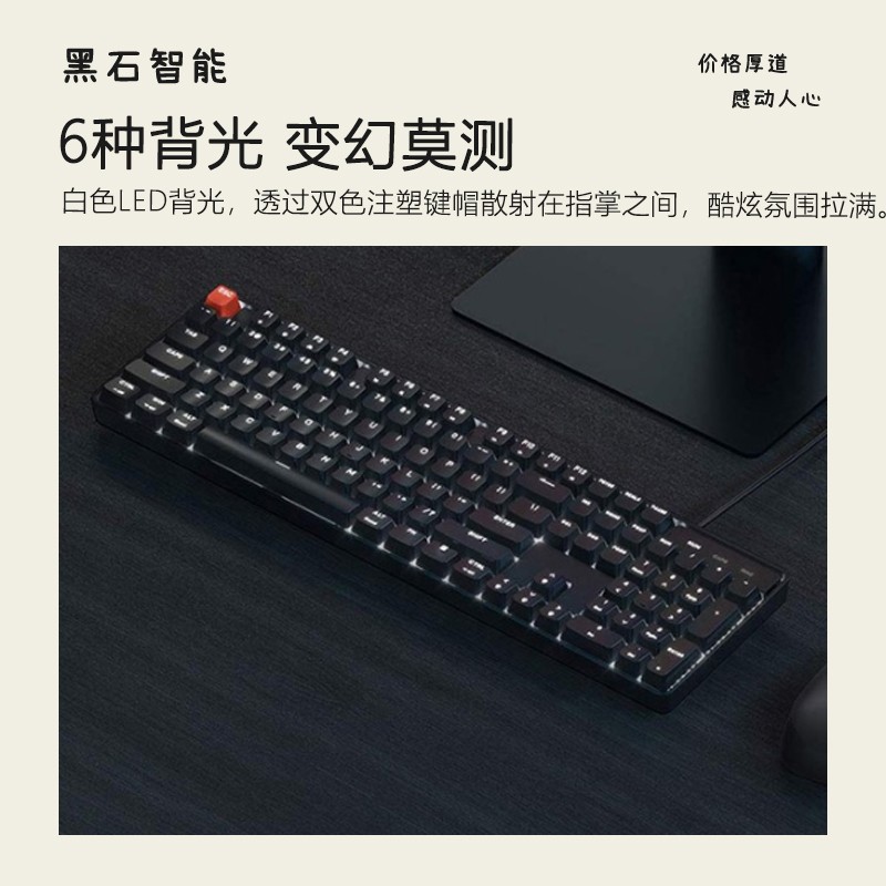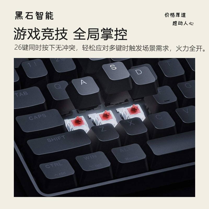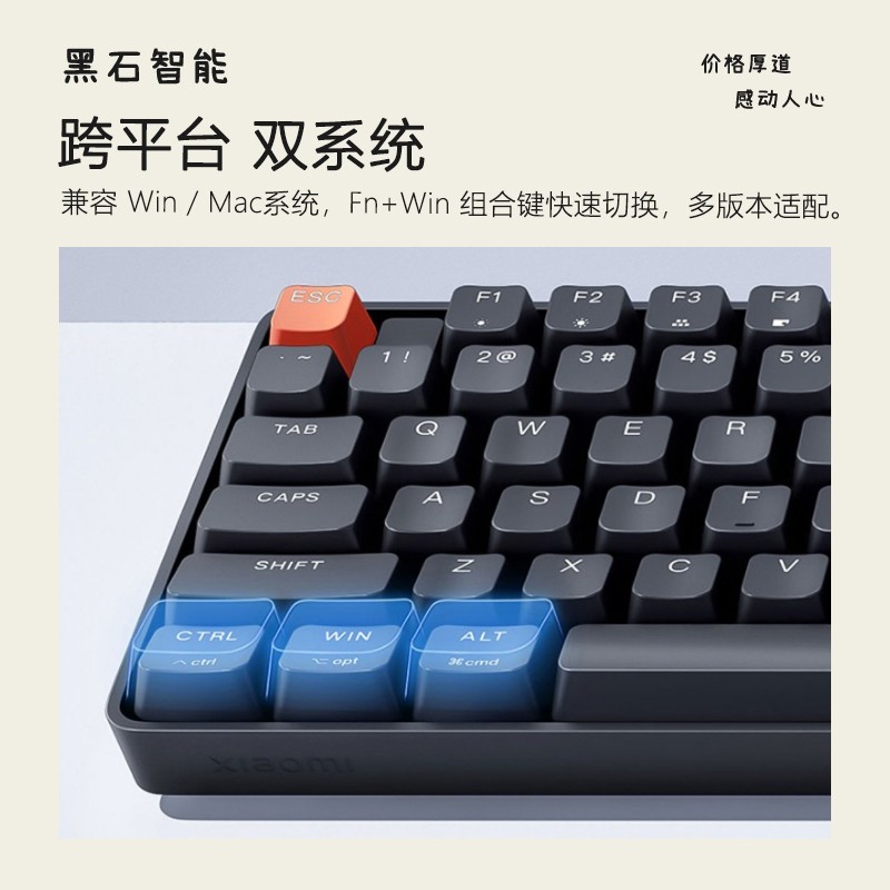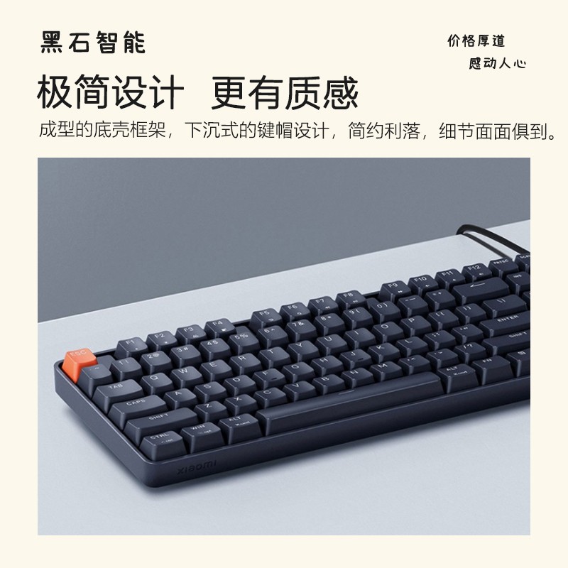 小米 QZJP01YM CHERRY版 机械键盘,采用德国CHERRY樱桃轴和耐磨PBT键帽,拥有电竞性能,全键无冲,极简主义的设计,键盘由键帽、上盖、钢板、电路板、下盖等五层结构组成,做工扎实,用料充足。内置的轴体安装强化钢板,加强了键盘的整体刚性和按键的敲击触感。定制的32位ARM主控MCU,48MHz主频,1000Hz回报率,USB2.0接口,可做到迅速响应。