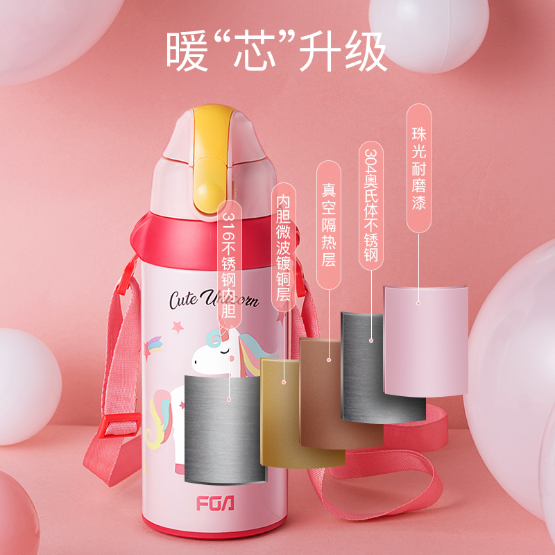富光(Fuguang)这款儿童保温杯,内胆选用316不锈钢材质,耐高温腐蚀,易于清洗。内外5层材质,层层包裹,有效保温保冷长达24小时。配备吸管式、倒水式两种杯盖,满足不同阶段的使用需求。防滑杯底,放置稳定无声。杯身颜色明亮配以卡通图案点缀,视觉上萌趣可爱。搭配同款杯套,保护杯身不受磕碰。